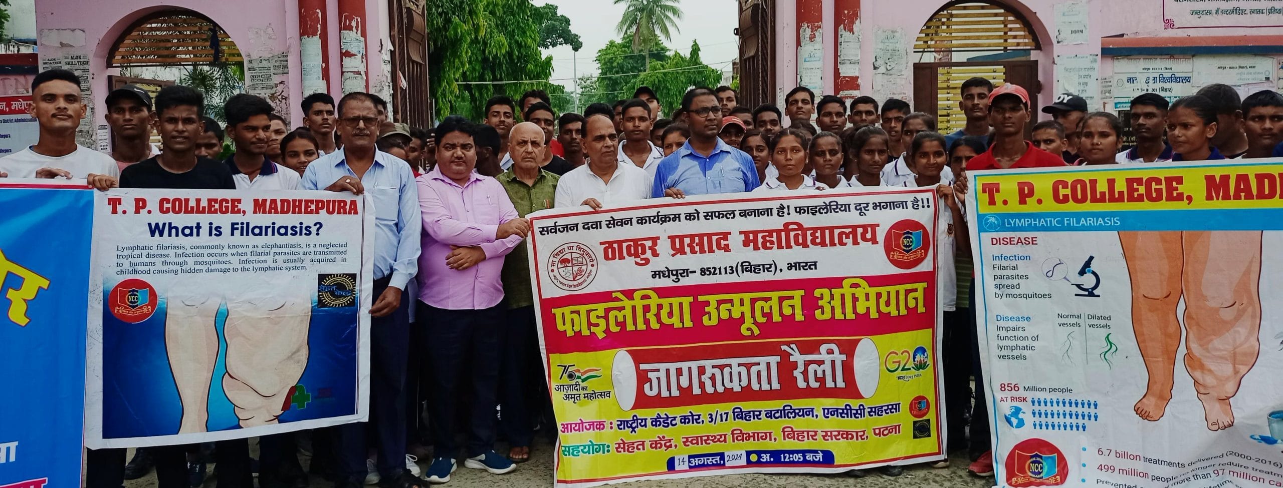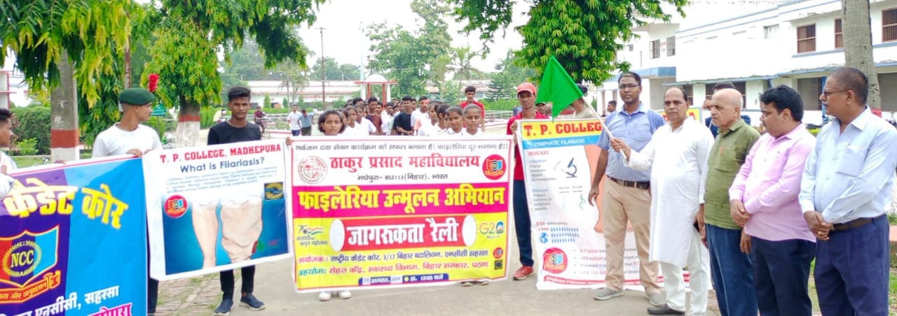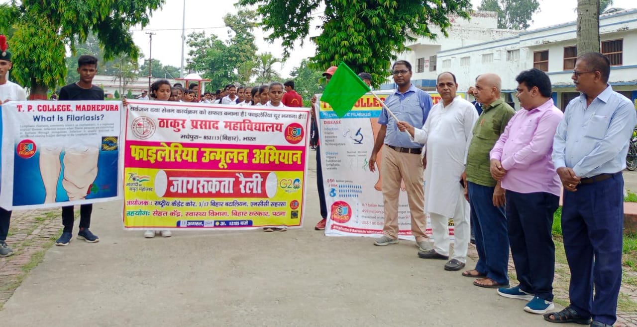 ठाकुर प्रसाद महाविद्यालय, मधेपुरा में सेहत केंद्र और राष्ट्रीय कैडेट कोर (एनसीसी) के संयुक्त तत्वावधान में फाइलेरिया उन्मूलन अभियान के अंतर्गत एक जागरूकता रैली का आयोजन किया गया।