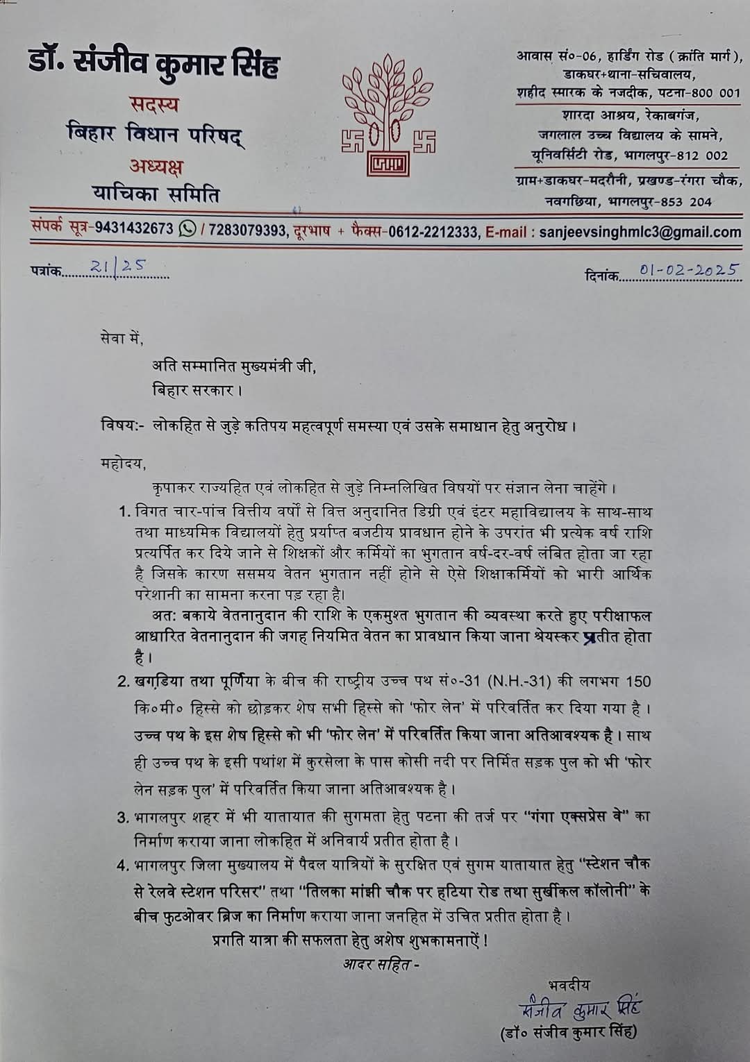 01 फरवरी, 2025 को भागलपुर में मुख्यमंत्री जी की प्रगति यात्रा कार्यक्रम के दौरान समीक्षा भवन में सभी जन-प्रतिनिधियों के साथ हुई बैठक में इन मुद्दों को उठाया गया और विस्तारपूर्वक इन सारी बातों से माननीय मुख्यमंत्री जी के साथ-साथ वित्त मंत्री माननीय सम्राट चौधरी जी, पूर्व शिक्षा मंत्री वर्तमान में जल संसाधन मंत्री माननीय विजय चौधरी जी और शिक्षा विभाग के अपर मुख्य सचिव श्री सिद्दार्थ जी के साथ-साथ कई अन्य शीर्षस्थ पदाधिकारी भी उपस्थित थे।