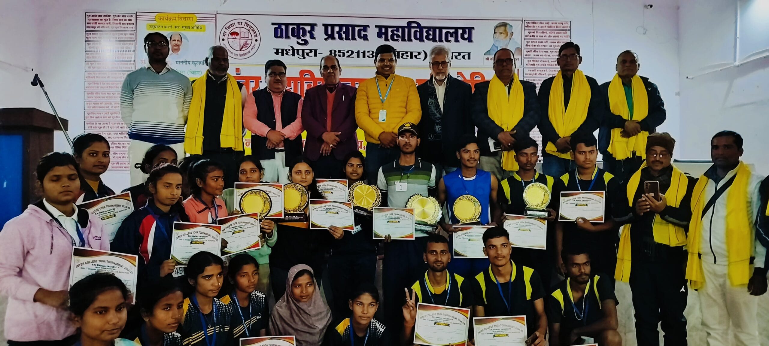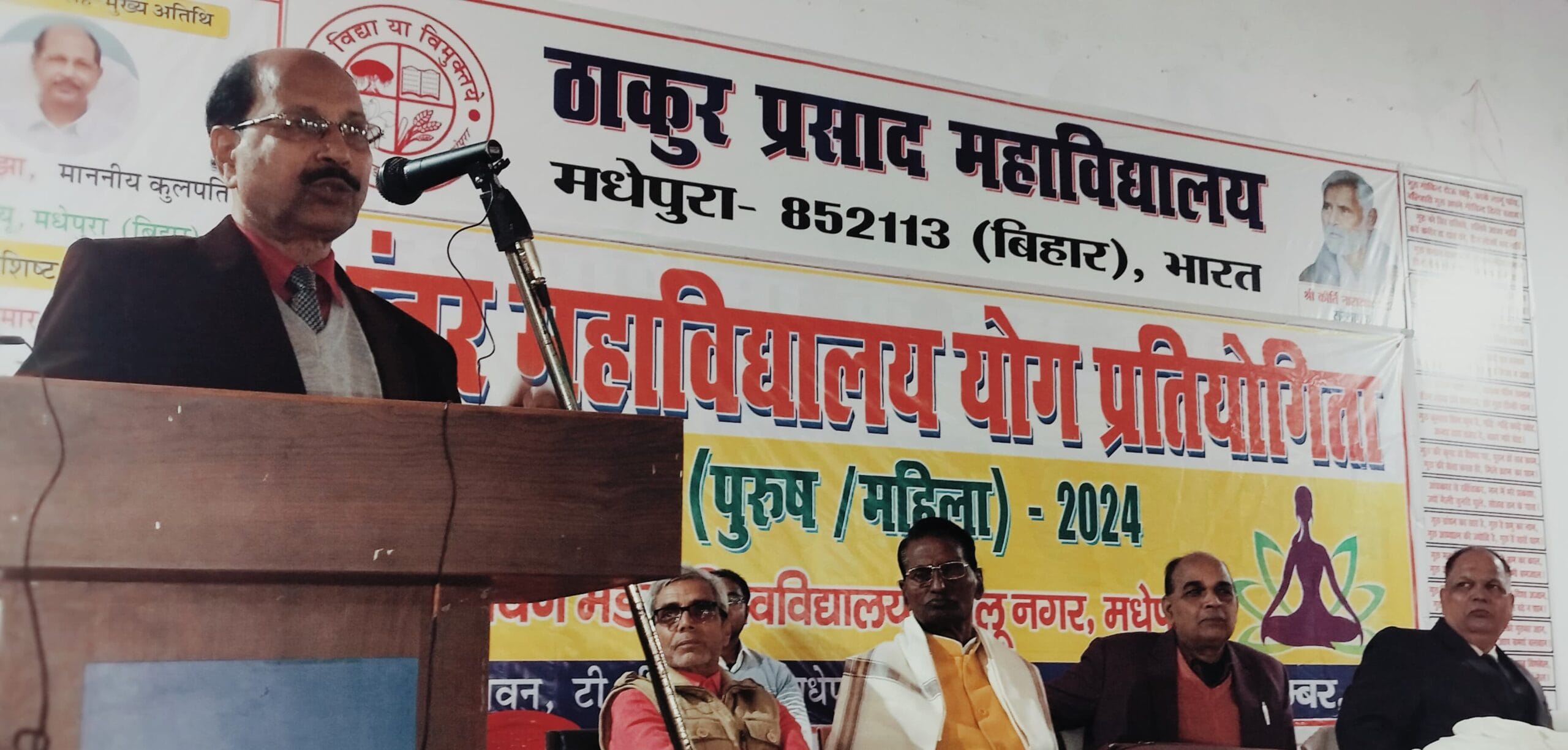 ठाकुर प्रसाद महाविद्यालय, मधेपुरा के तत्वावधान में मंगलवार को अंतर महाविद्यालय योग प्रतियोगिता (पुरुष-महिला)- 2024 का आयोजन किया गया। इसमें उद्घाटनकर्ता-सह-मुख्य अतिथि के रूप में बीएनएमयू, मधेपुरा के कुलपति प्रो. विमलेन्दु शेखर झा की गरिमामयी उपस्थिति रही। कुलपति ने कहा कि योग भारतीय दर्शन, संस्कृति एवं परंपरा में आदिकाल से शामिल है। महर्षि पतंजलि के हजारों वर्ष पूर्व भी भारत में योग की विभिन्न पद्धतियों का उल्लेख मिलता है।