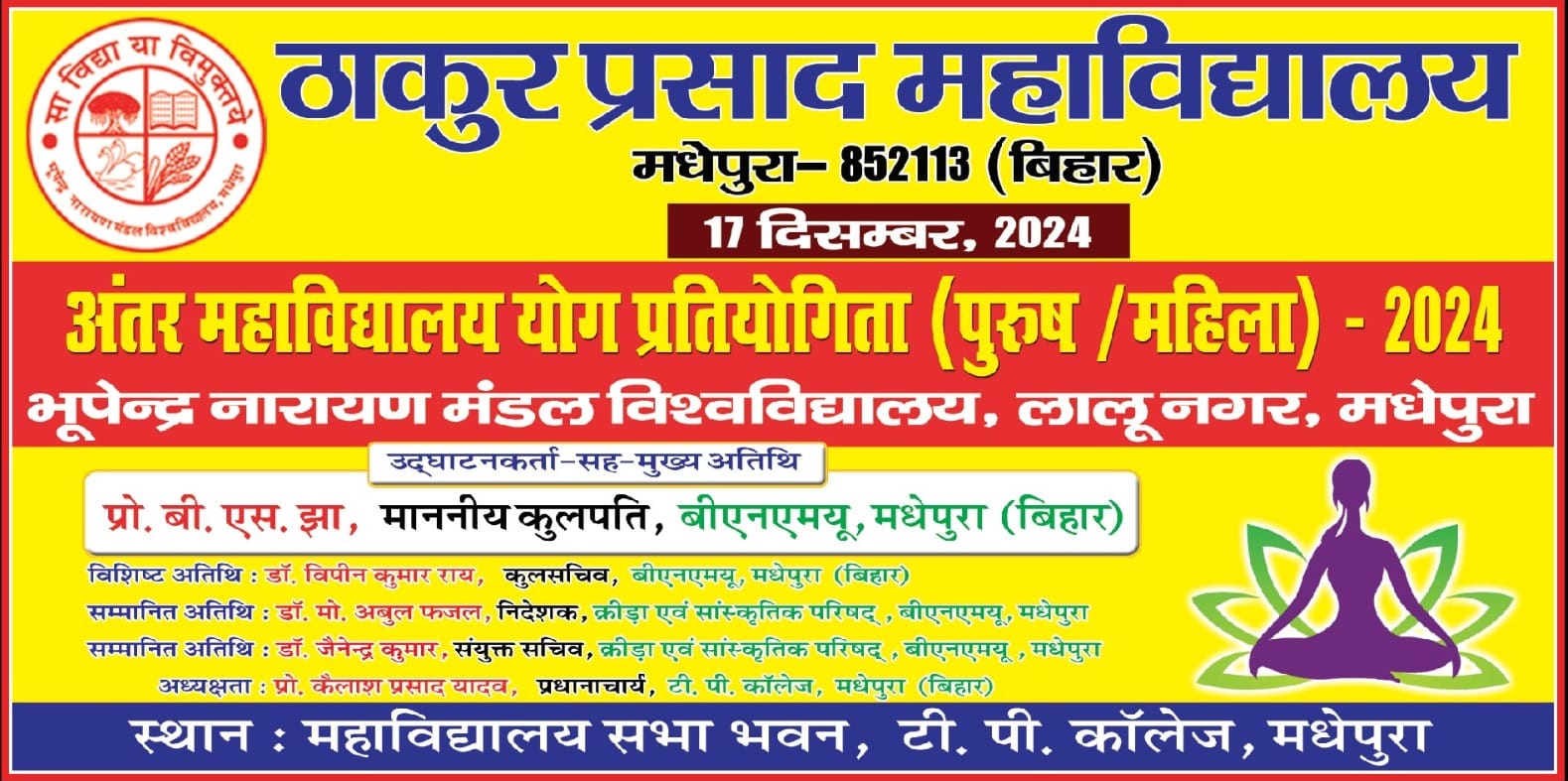 ठाकुर प्रसाद महाविद्यालय, मधेपुरा के तत्वावधान में 17 दिसंबर, 2024 (मंगलवार):को अंतर महाविद्यालय योग प्रतियोगिता (पुरुष-महिला)- 2024 का आयोजन किया जाएगा। इसमें उद्घाटनकर्ता- सह-मुख्य अतिथि के रूप में बीएसएमयू, मधेपुरा के कुलपति प्रो. विमलेन्दु शेखर झा की गरिमामयी उपस्थिति रहेगी। इस अवसर पर कुलसचिव प्रो. विपीन कुमार राय विशिष्ट अतिथि तथा क्रीड़ा एवं सांस्कृतिक परिषद् के निदेशक डॉ. मो. अबुल फजल एवं संयुक्त सचिव डॉ. जैनेन्द्र कुमार सम्मानित अतिथि होंगे। आयोजन में सहयोग हेतु पतंजलि योग समिति के अध्यक्ष राकेश कुमार भारती को आमंत्रित किया गया है।