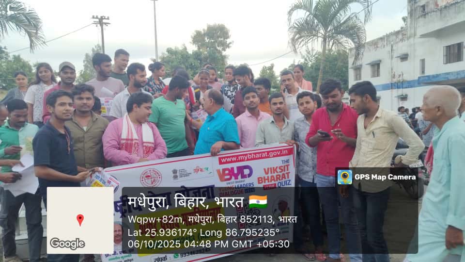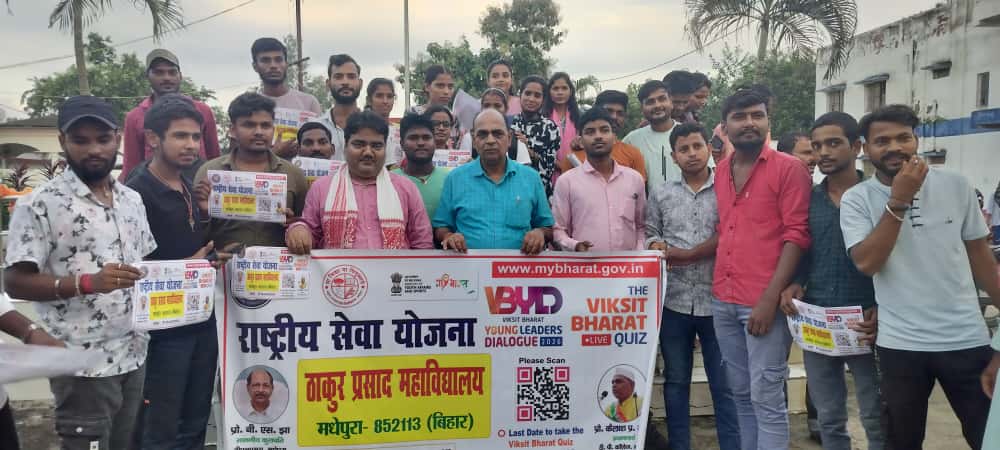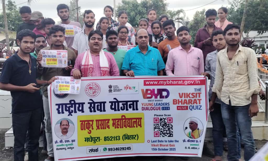 माय भारत पोर्टल एवं माय गवर्मेंट पोर्टल पर ऑनलाइन आयोजित विकसित भारत क्विज प्रतियोगिता एक सितंबर, 2025 से शुरू हुई है और 15 अक्टूबर, 2025 तक चलेगी। इसमें ठाकुर प्रसाद महाविद्यालय, मधेपुरा की व्यापक भागीदारी सुनिश्चित की जाए। यह बात प्रधानाचार्य प्रो. कैलाश प्रसाद यादव ने कही। वे सोमवार को विद्यार्थियों के बीच जागरूकता कार्यक्रम को संबोधित कर रहे थे।