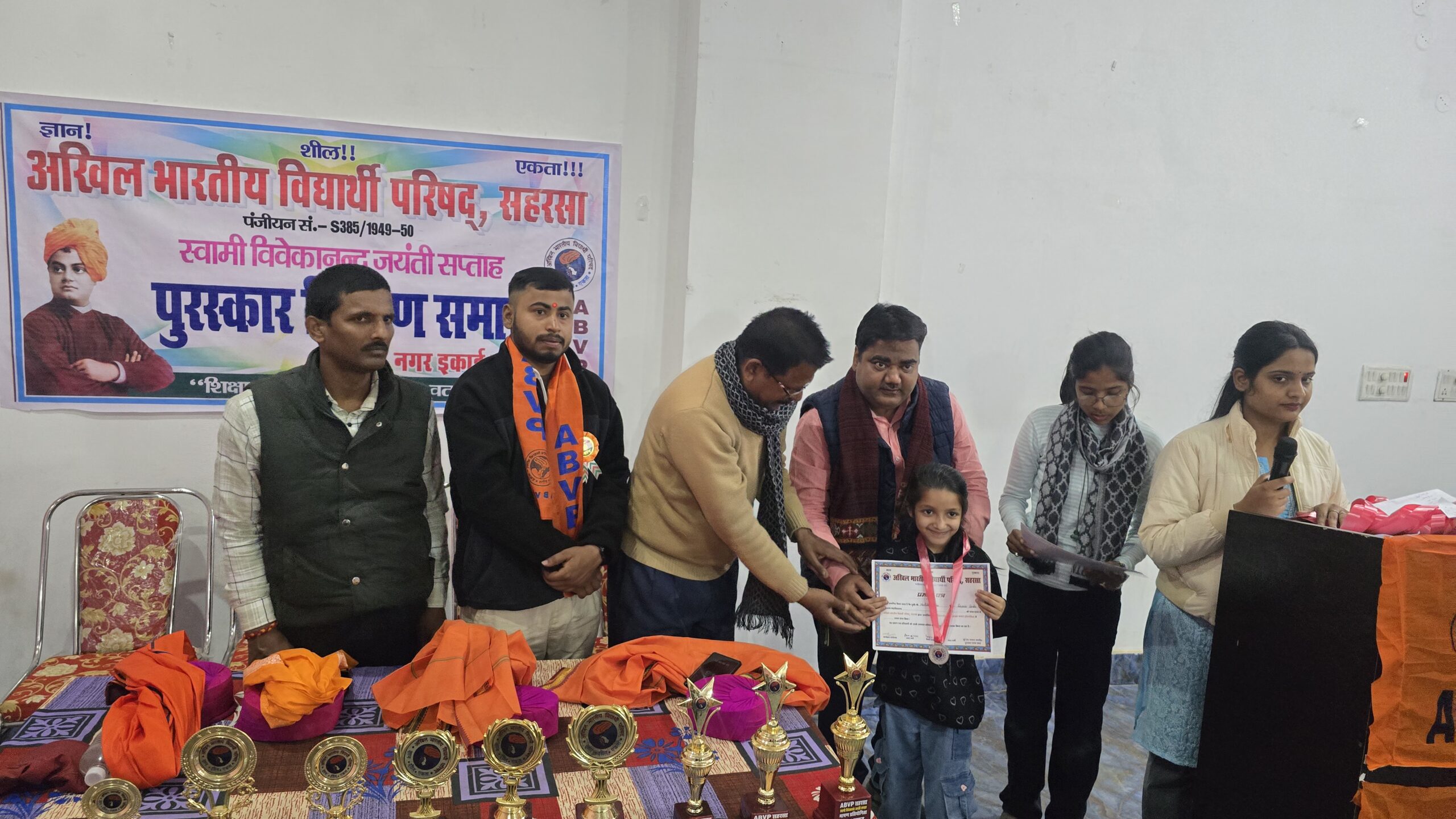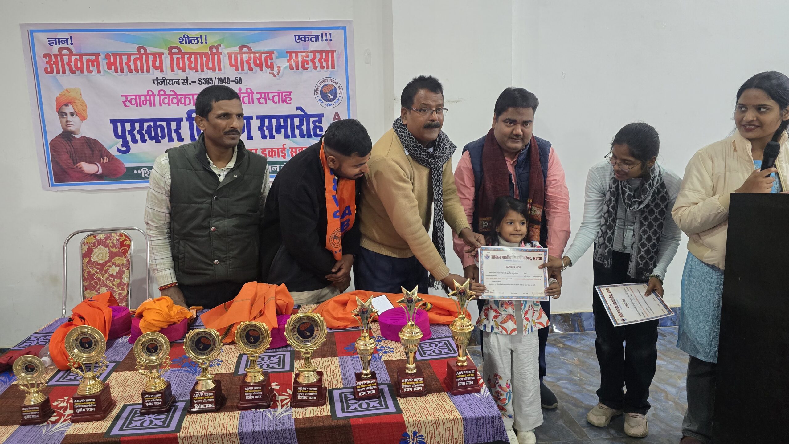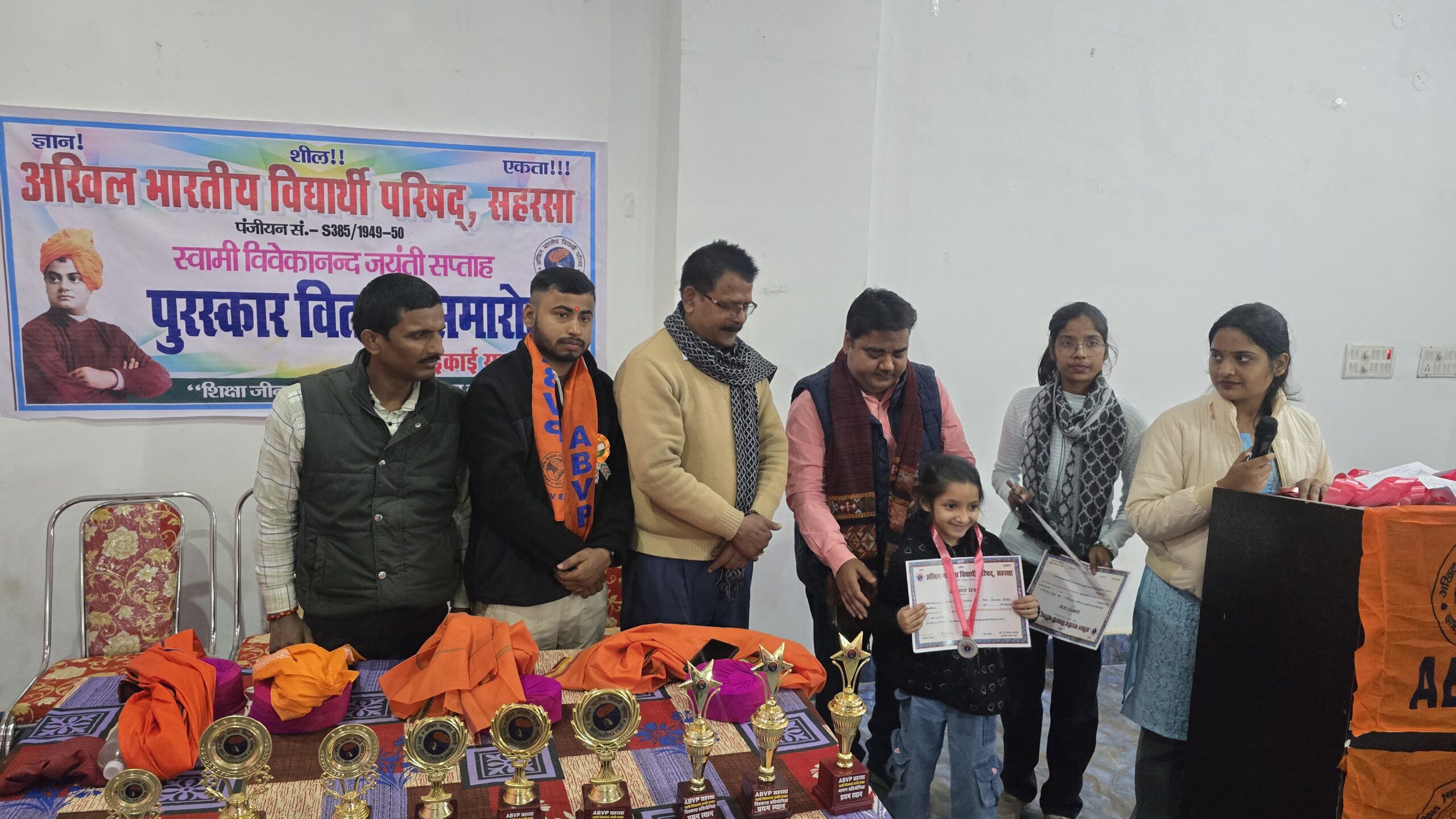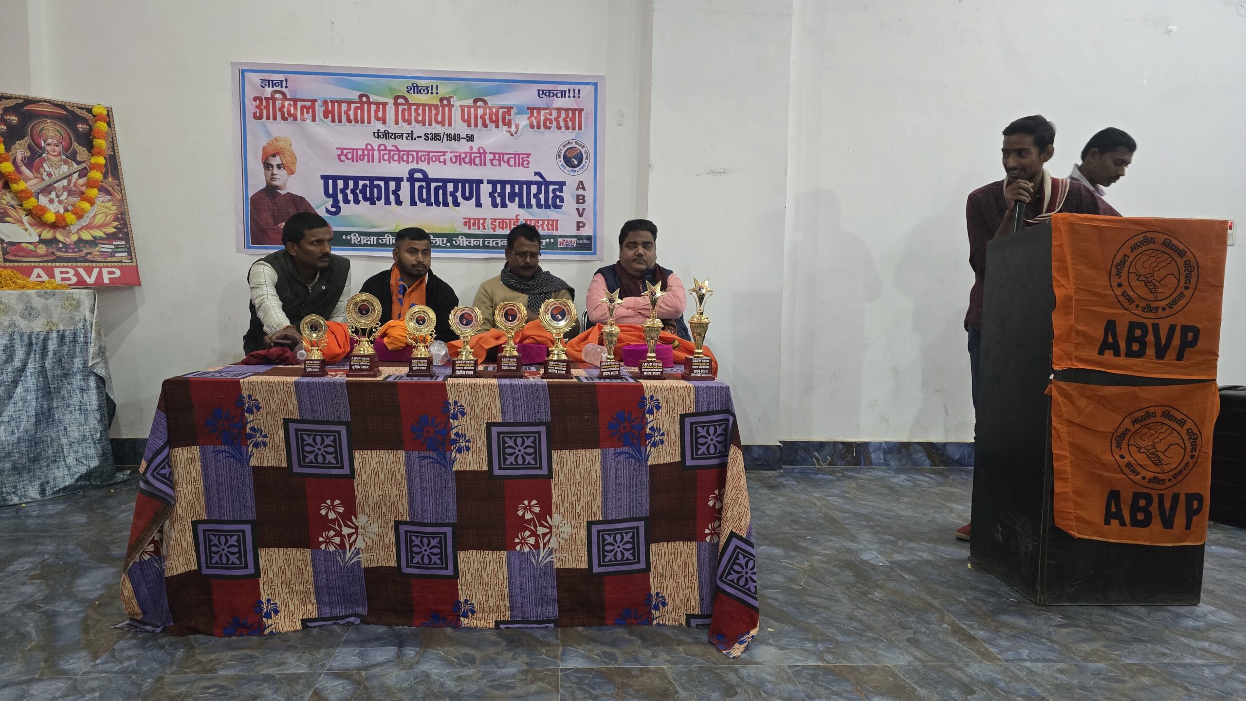 मधेपुरा। स्वामी विवेकानंद जयंती एवं राष्ट्रीय युवा दिवस सप्ताह के उपलक्ष्य में अखिल भारतीय विद्यार्थी परिषद (अभाविप), सहरसा द्वारा गुरूवार को एक स्थानीय विवाह भवन में पुरस्कार वितरण समारोह का आयोजन किया गया। इसमें मुख्य रूप से गत दिनों शहर के विभिन्न संस्थानों में आयोजित प्रतियोगिता के प्रतिभागियों को प्रमाण-पत्र एवं पुरस्कार प्रदान किया गया।