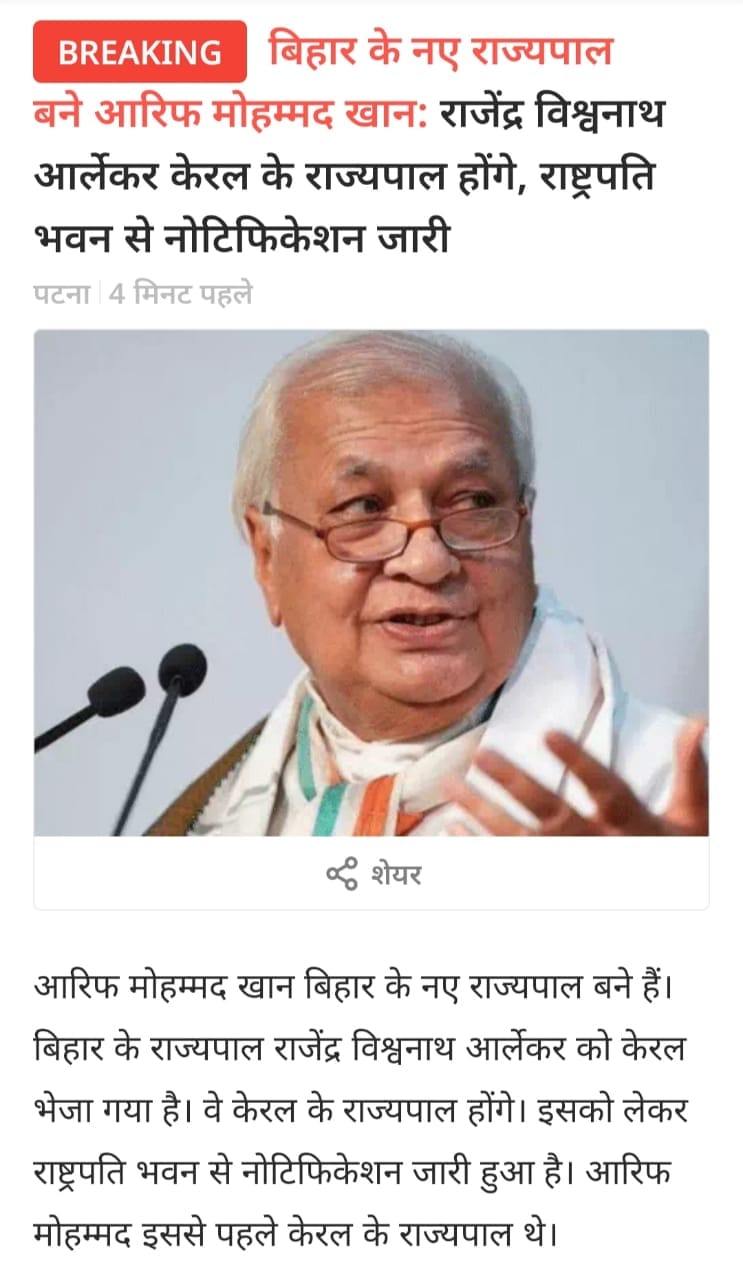 आरिफ मोहम्मद खान ने 06 सितंबर 2019 को केरल के 22वें राज्यपाल के रूप में पदभार ग्रहण किया था। उन्हें अब केरल से बिहार भेज दिया गया है।