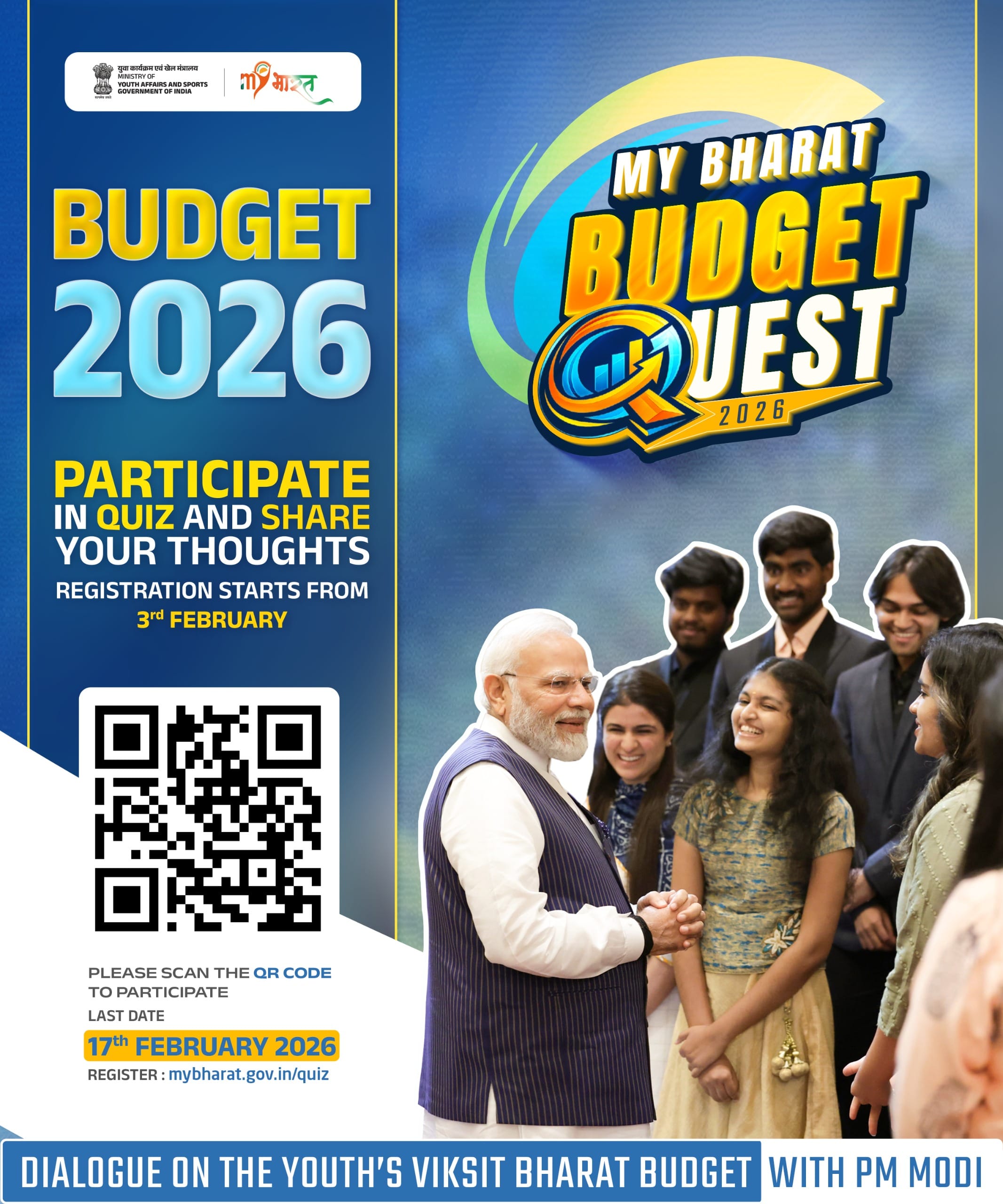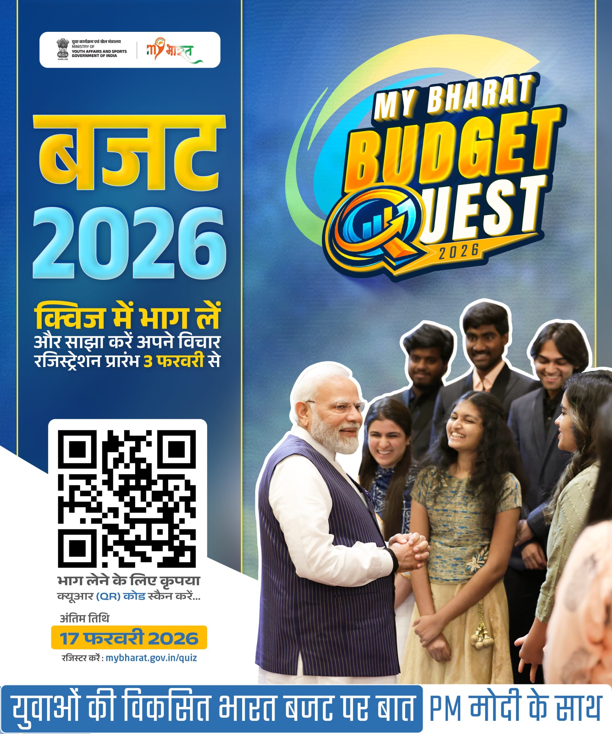 माय भारत बजट क्वेस्ट-2026 से संबंधित एक ऑनलाइन बैठक निदेशक, राष्ट्रीय सेवा योजना, नई दिल्ली की अध्यक्षता में 06 फरवरी, 2026 (शुक्रवार) को दोपहर बारह बजे से आयोजित की जानी है। क्षेत्रीय निदेशक विनय कुमार ने इसमें भाग लेने हेतु सभी विश्वविद्यालयों के कार्यक्रम पदाधिकारियों से अनुरोध किया है। यह जानकारी बीएनएमयू, मधेपुरा के कार्यक्रम समन्वयक डॉ. सुधांशु शेखर ने दी।