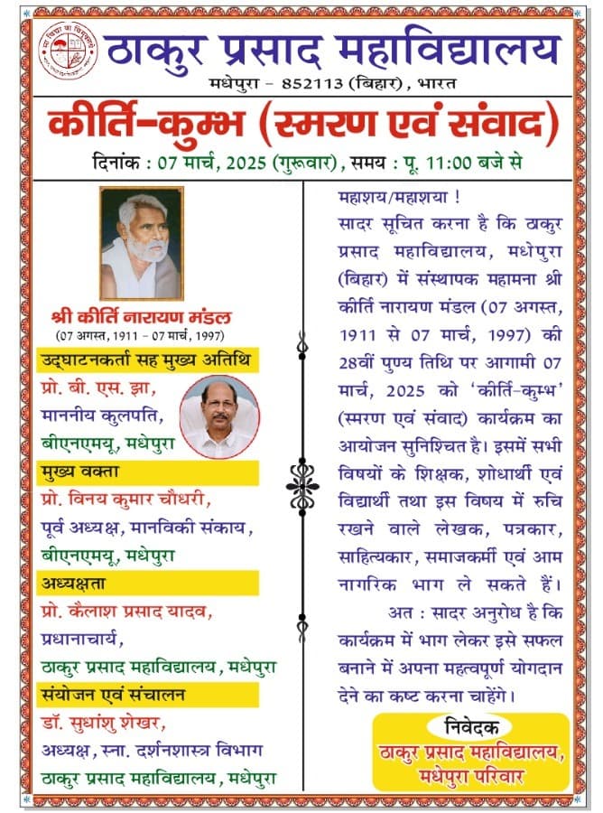 ठाकुर प्रसाद महाविद्यालय, मधेपुरा में संस्थापक महामना श्री कीर्ति नारायण मंडल (1911-1997) की 28 वीं पुण्यतिथि पर आगामी 07 मार्च, 2025 को पू. 11:00 बजे से ‘कीर्ति-कुम्भ’ (स्मरण एवं संवाद) कार्यक्रम का आयोजन सुनिश्चित है। कार्यक्रम में उद्घाटनकर्ता सह मुख्य अतिथि के रूप में बीएनएमयू, मधेपुरा के कुलपति प्रो. बी. एस. झा की गरिमामयी उपस्थिति रहेगी। प्रधानाचार्य प्रो. कैलाश प्रसाद यादव ने बताया कि कार्यक्रम के प्रारंभ में कुलपति एवं अन्य अतिथियों द्वारा महाविद्यालय के विज्ञान परिसर स्थित कीर्ति नारायण मंडल की प्रतिमा पर माल्यार्पण एवं पुष्पांजलि की जाएगी। तदुपरांत स्मार्ट क्लास रूम में विधिवत उनके व्यक्तित्व एवं कृतित्व पर संवाद कार्यक्रम आयोजित किया जाएगा।