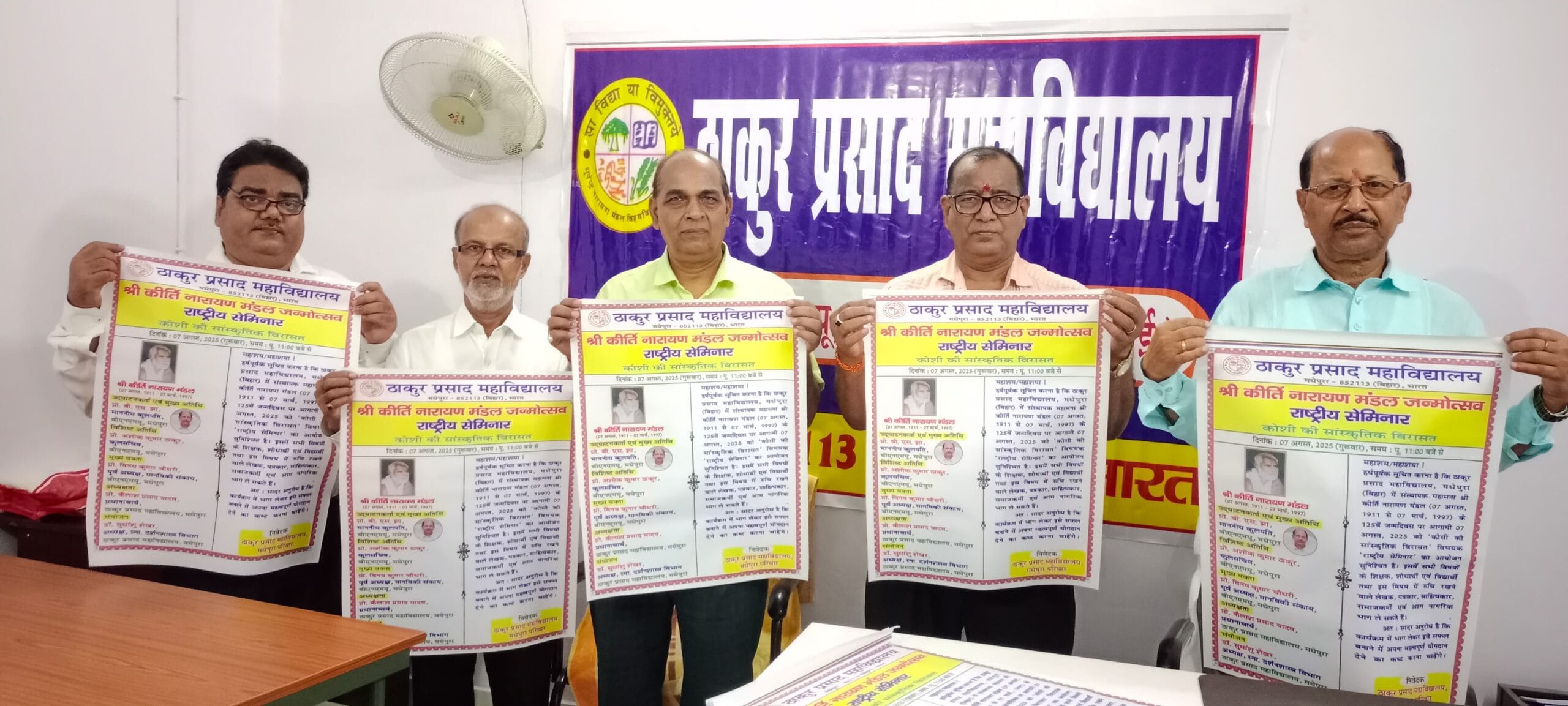 ठाकुर प्रसाद महाविद्यालय, मधेपुरा (बिहार) में संस्थापक महामना कीर्ति नारायण मंडल (7 अगस्त, 1911 से 7 मार्च, 1997) की 125वीं जयंती पर आगामी 7 अगस्त, 2025 को कोसी की सांस्कृतिक विरासत’ विषय पर ‘राष्ट्रीय सेमिनार’ का आयोजन किया जाएगा। बुधवार को बीएनएमयू, मधेपुरा के कुलपति प्रो. बी. एस. झा ने इस सेमिनार का पोस्टर जारी किया।