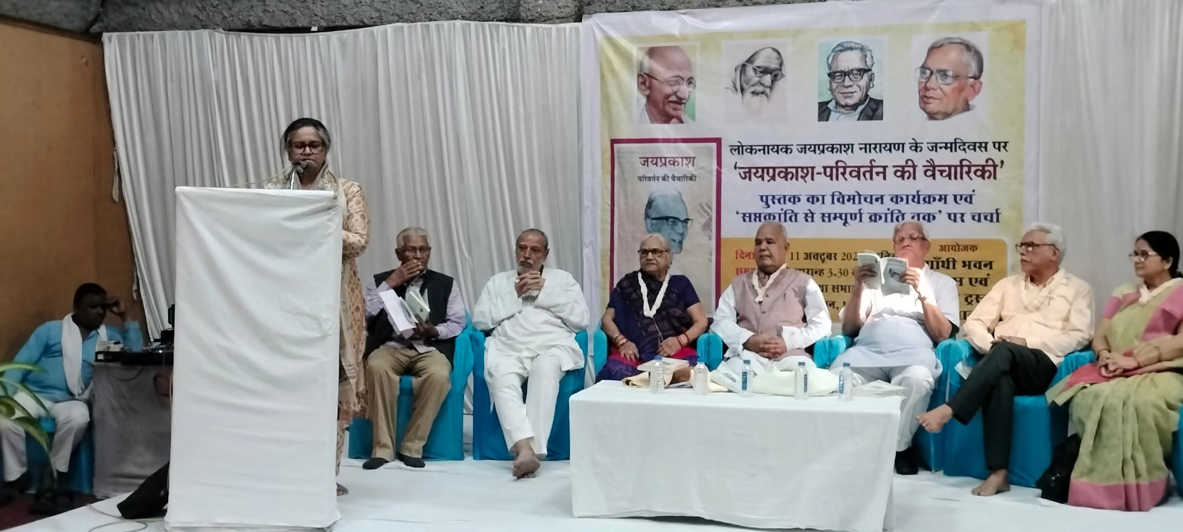 पुस्तक ‘ जयप्रकाश – परिवर्तन की वैचारिकी ‘ के विषय में उन्होंने बताया कि यह जेपी के 1934 से 1979 तक के लेख, साक्षात्कार आदि पर आधारित है। भारतीय समाजवाद की जिस विचारधारा को धूमिल करने की कोशिश की जा रही है उस विरासत को बचाने की जरूरत बताते हुए शिवदयाल जी ने कहा साल 1934 में ही कांग्रेस के अंदर कांग्रेस सोशलिस्ट पार्टी का जन्म हुआ था उसके कार्यकारी महासचिव जेपी थे। सीएसपी के नायक आचार्य नरेन्द्र देव, अच्युत पटवर्धन, यूसुफ मेहर अली, डॉ राममनोहर लोहिया, जयप्रकाश नारायण आदि ने भारत की स्वतंत्रता के बाद एक समतामूलक शोषणविहीन व अहिंसक समाज का सपना देखा था। इन नायकों की विरासत का जो कुछ श्रेष्ठ है उसे साथ लेकर चलने की जरूरत है। 1942 में जेपी ने युद्धविरोधी भाषण दिया। हजारीबाग जेल से वे अपने साथियों के साथ भाग निकले, फिर भूमिगत आंदोलन चलाया। 1945 में फिर गिरफ्तार हुए और लाहौर जेल में कैद रहे। सर्व सेवा संघ से छपी किताब ‘ Inside Lahore fort ‘ उस कारावास कहानी का वर्णन मिलता है। जेपी की विचार सरणि का परिचय उनकी विचार यात्रा में मिलता है। पूंजीवाद के गढ़ अमेरिका में वे पढ़ने गए और प्रखर मार्क्सवादी बनकर देश वापस लौटे। लेकिन बाद में लोकतांत्रिक समाजवाद, महात्मा गांधी व सर्वोदय का असर उन पर गहरा हुआ। समाजवाद के एक ही स्वरूप को वे मानते थे जिसका चरम मूल्य स्वतंत्रता था। जवाहरलाल नेहरू में समाजवादियों को बहुत सम्भावना दिखती थी और समाजवादी उन्हें अपना मानते थे, पर बाद में मोहभंग हुआ और समाजवादी कांग्रेस से अलग हुए। यह वही समय था जब कांग्रेस के नेता तक चुके थे और सोशलिस्ट ऊर्जा से भरे हुए थे। आचार्य जेबी कृपलानी कांग्रेस के अध्यक्ष थे। वे चाहते थे कि प्रधानमंत्री नेहरू कांग्रेस अध्यक्ष की उपेक्षा न करें। लेकिन ऐसा हुआ नहीं। कृपलानी ने पद छोड़ दिया। तब कांग्रेस अध्यक्ष के लिए जेपी का नाम सुझाया गया। जेपी तैयार नहीं हुए। तब डॉ राजेन्द्र प्रसाद अध्यक्ष बने। 1952 के चुनाव में सोशलिस्टों को गहरी निराशा मिली । जेपी सर्वोदय की ओर चले गए। 1952 में ही रेलकर्मियों की मांगों को लेकर पूना में जेपी ने बत्तीस दिन का उपवास किया। सरकार ने वादा करके अनशन तुड़वाया और बाद में वादे से पलट गई। द्वंदात्मक भौतिकवाद की देवी से मुक्त होकर जेपी सर्वोदय में गये पर सर्वोदय के साथ सार्वजनिक जीवन से उनका जुड़ाव बना रहा। बंगलादेश के मुक्ति युद्ध के समय विश्व के विभिन्न देशों में भारत का पक्ष रखने के लिए आधिकारिक रूप से उन्हें भेजा गया। संयुक्त राष्ट्र संघ के अध्यक्ष ऊ थांट को भारत के पक्ष से उन्होंने परिचित कराया। चंबल , नागालैंड जैसे अशांत क्षेत्रों में शांति कायम करने व भावात्मक एकता स्थापित करके राष्ट्रनिर्माण का काम किया। ऐसे जेपी को आप