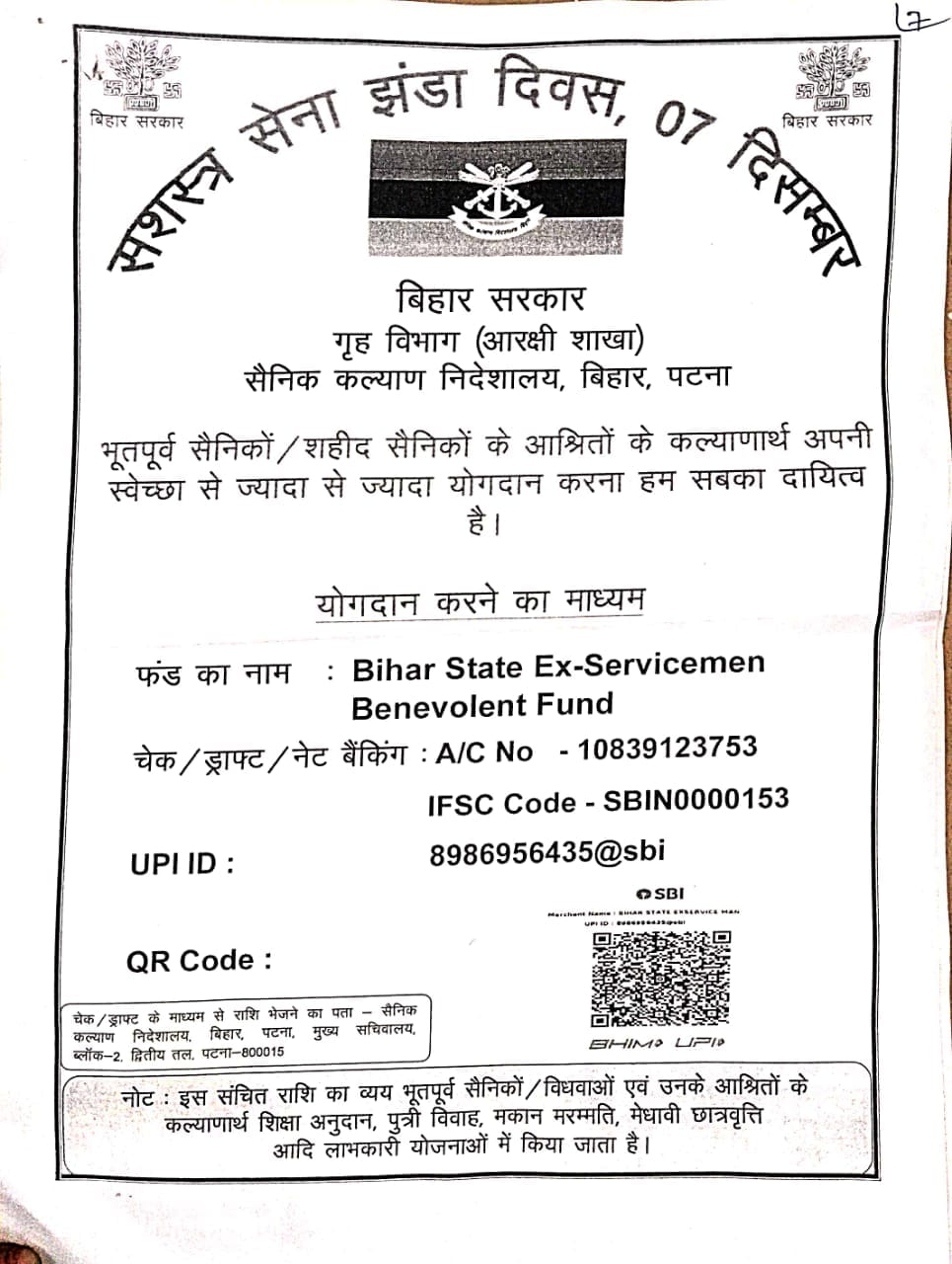 उन्होंने बताया कि सभी पदाधिकारियों, संकायाध्यक्षों, विभागाध्यक्षों एवं प्रधानाचार्यों से अनुरोध किया गया है कि झंडा दिवस कोष हेतु अधिकाधिक राशि संग्रहित कर निदेशक, सैनिक कल्याण निदेशालय, पटना को उपलब्ध कराते हुए इसकी सूचना एनएसएस कार्यालय को अनिवार्य रुप से दी जाए।