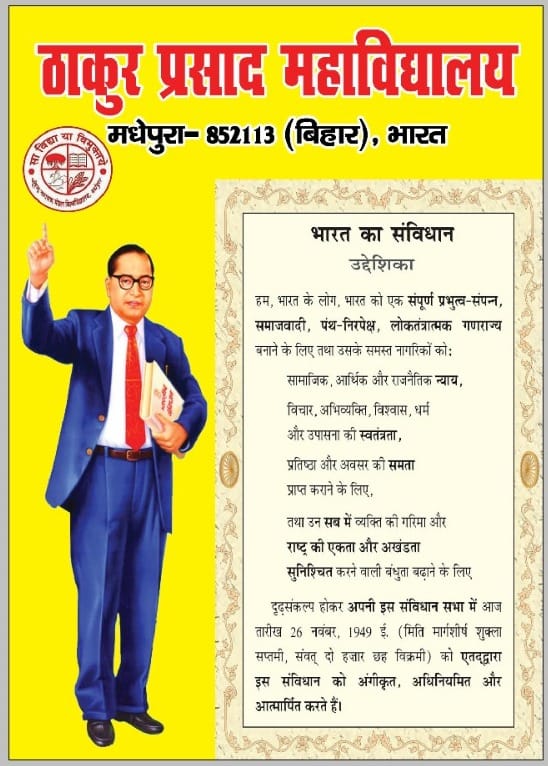 ठाकुर प्रसाद महाविद्यालय, मधेपुरा में भारतरत्न बाबा साहेब डॉ. भीमराव अंबेडकर 134वीं जयंती पर 14 अप्रैल, 2025 (सोमवार) को आ. 12:05 बजे से डॉ. अंबेडकर जन्मोत्सव समारोह का आयोजन किया गया है। इस अवसर पर राष्ट्र-निर्माण में डॉ. अंबेडकर के योगदान पर चर्चा होगी और संविधान की उद्देशिका का सामुहिक वाचन किया जाएगा।