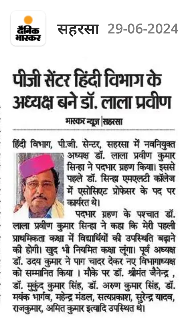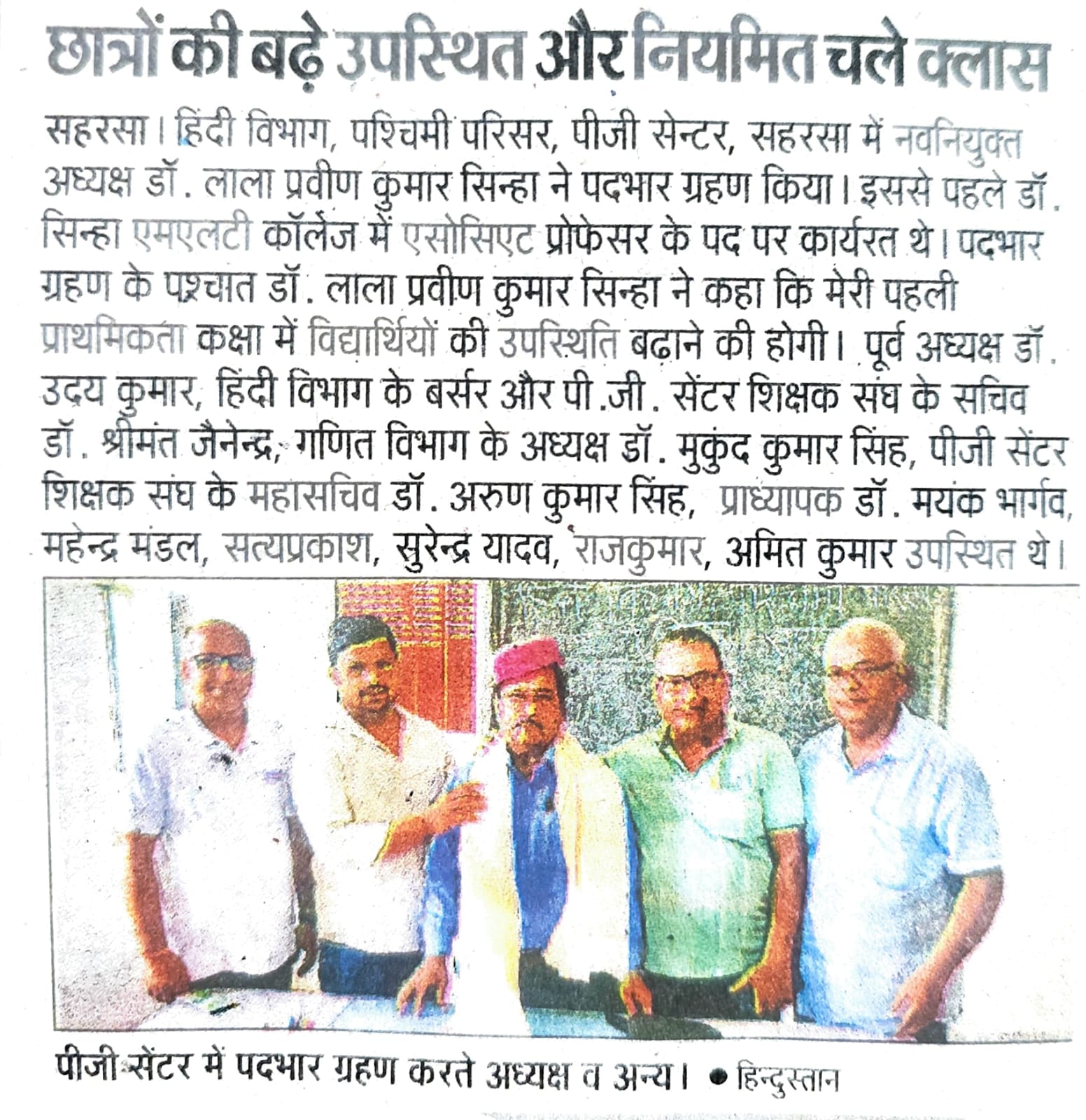 हिंदी विभाग पश्चिमी परिसर पीजी सेंटर में नवनियुक्त अध्यक्ष डॉ लाला प्रवीण कुमार सिन्हा ने शुक्रवार को पदभार ग्रहण किया. इससे पहले डॉ सिन्हा एमएलटी कॉलेज, सहरसा में एसोसिएट प्रोफेसर के पद पर कार्यरत थे.