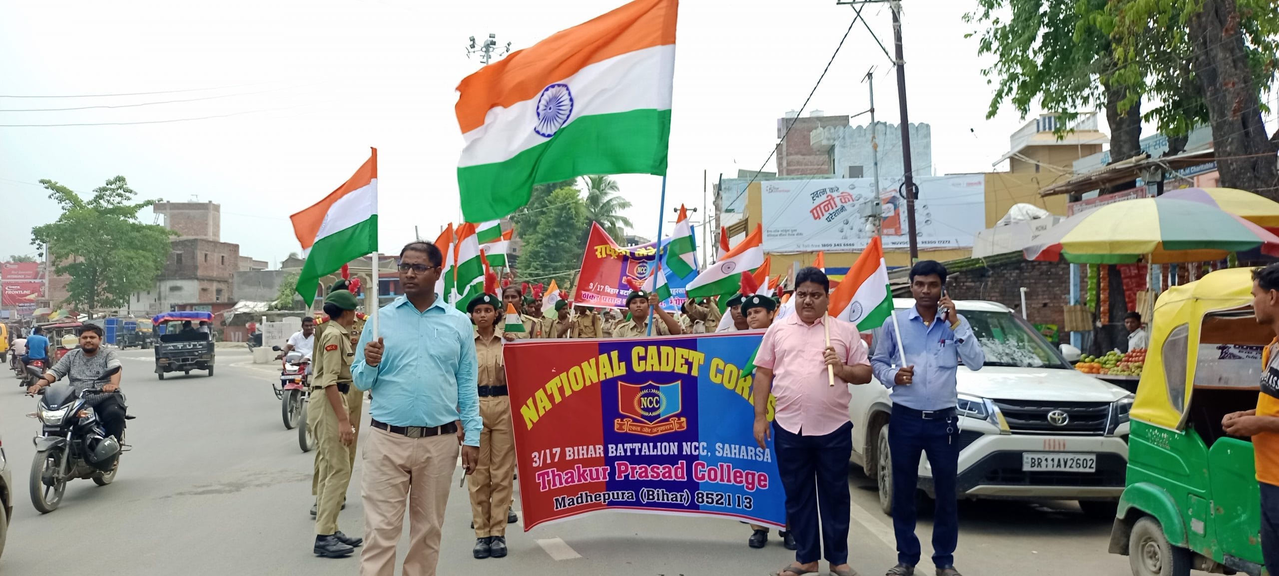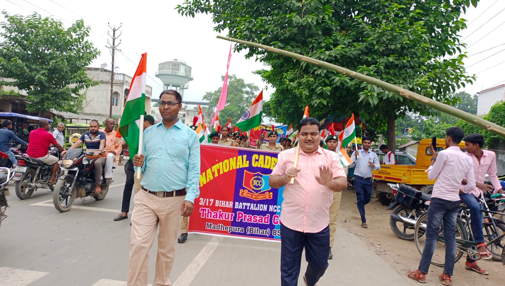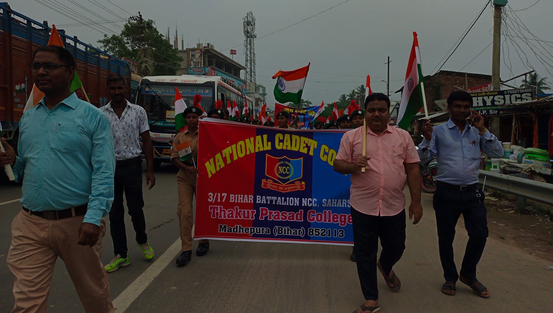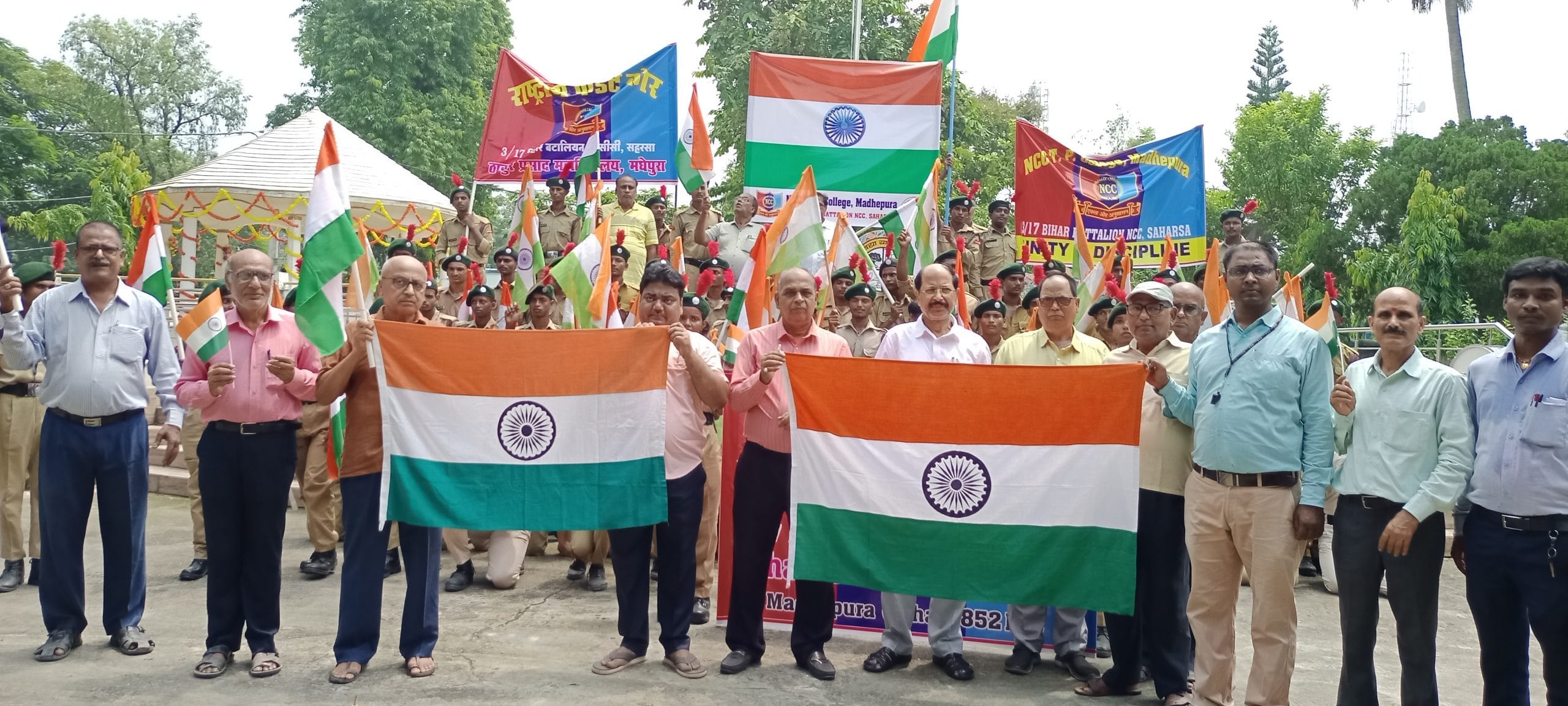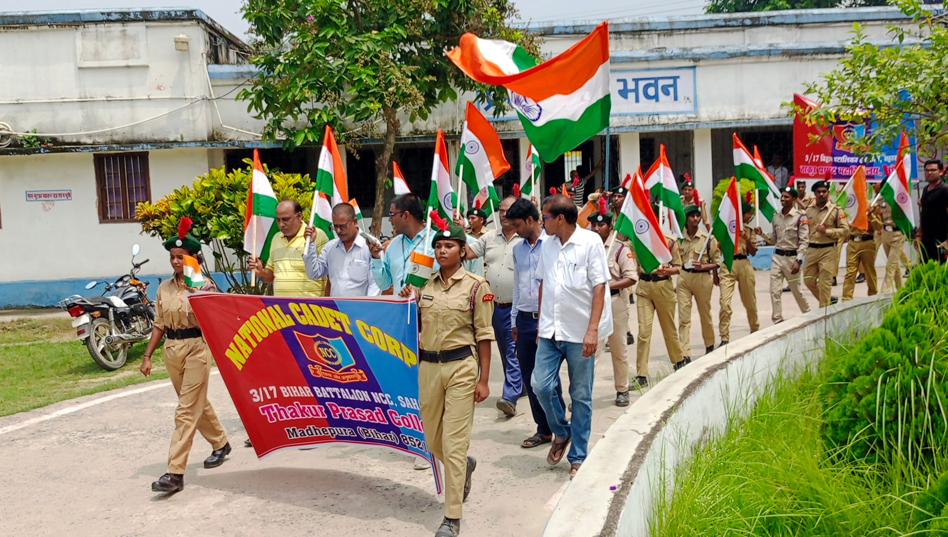 यह बात बीएनएमयू, मधेपुरा के कुलपति प्रो. बी. एस. झा ने कही। वे मंगलवार को तिरंगा रैली में शामिल जनसमूह को संबोधित कर रहे थे। कार्यक्रम का आयोजन ठाकुर प्रसाद महाविद्यालय, मधेपुरा के राष्ट्रीय कैडेट कोर (एनसीसी) एवं राष्ट्रीय सेवा योजना (एनएसएस) के संयुक्त तत्वावधान में किया गया।