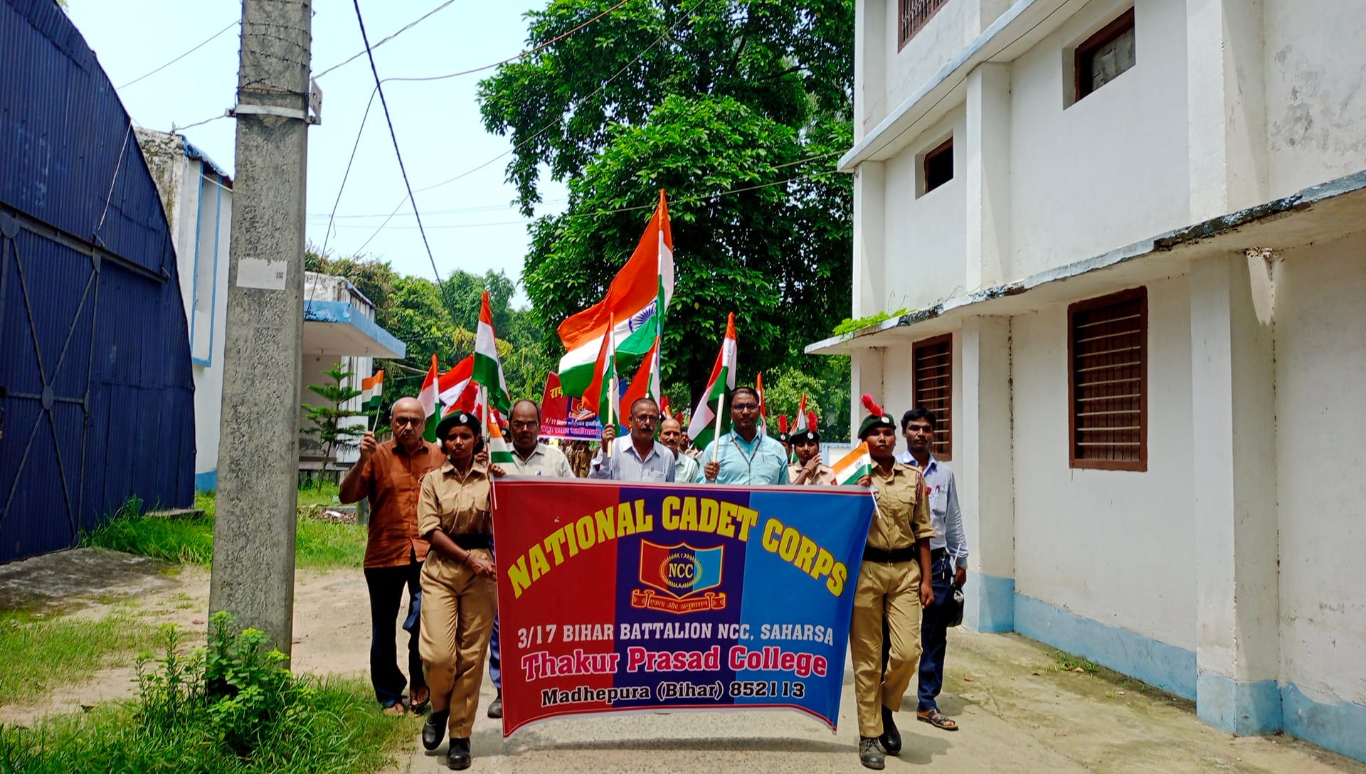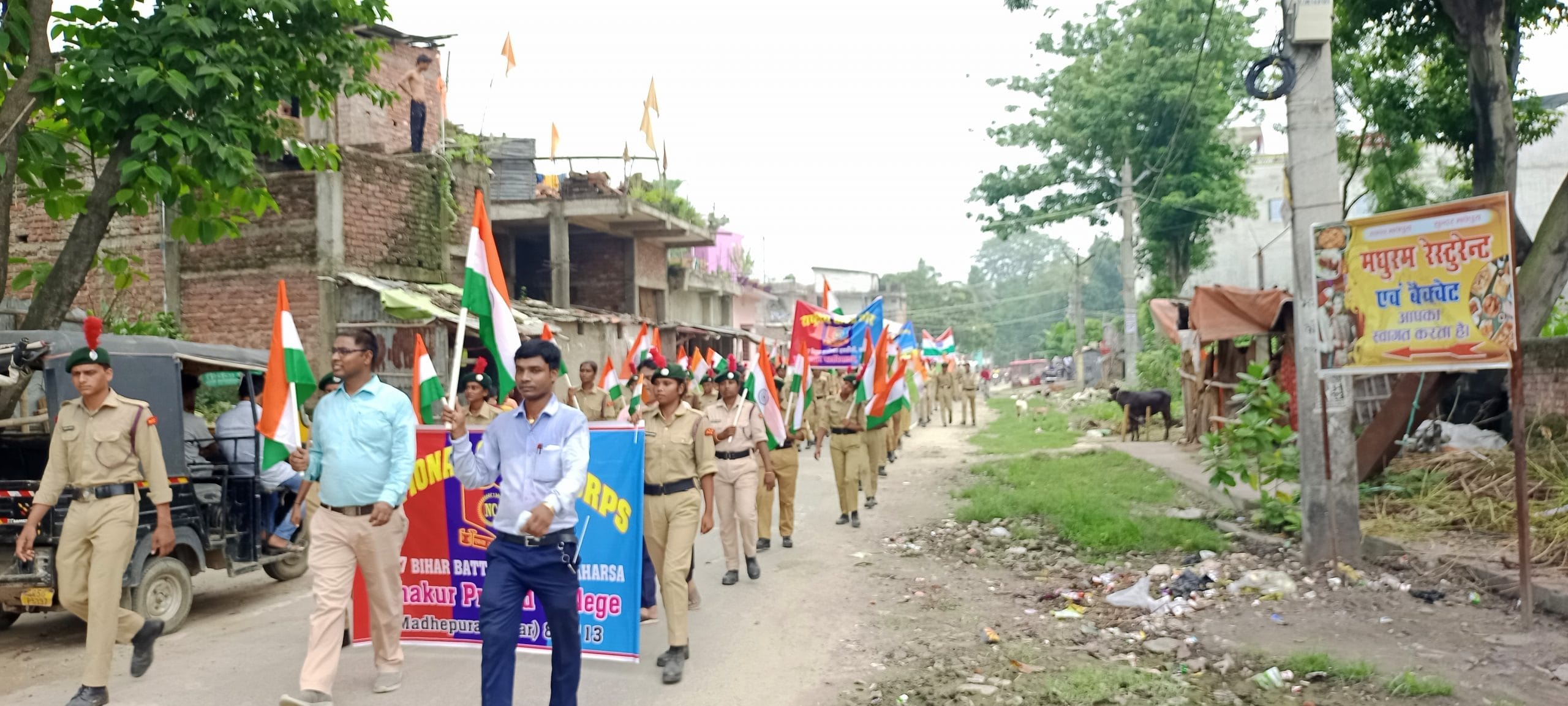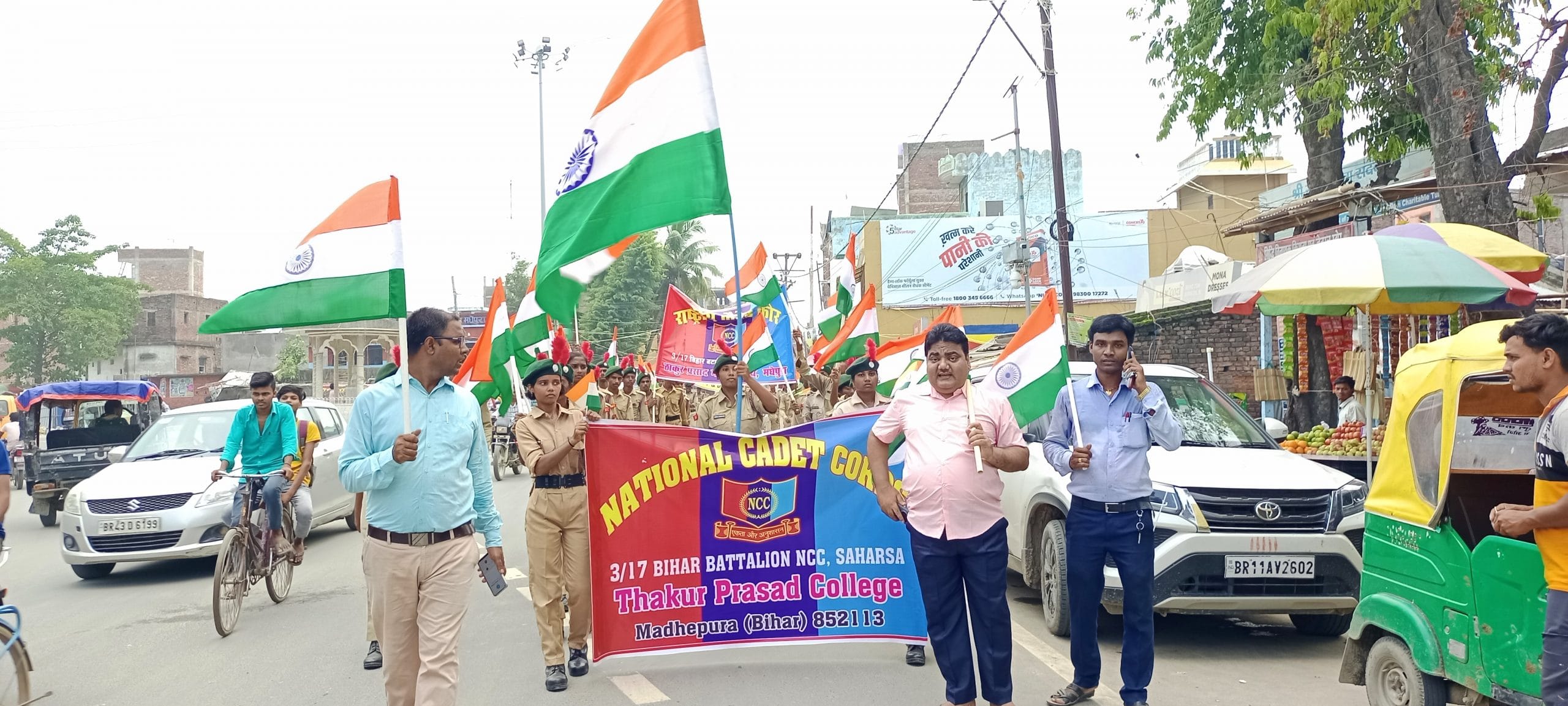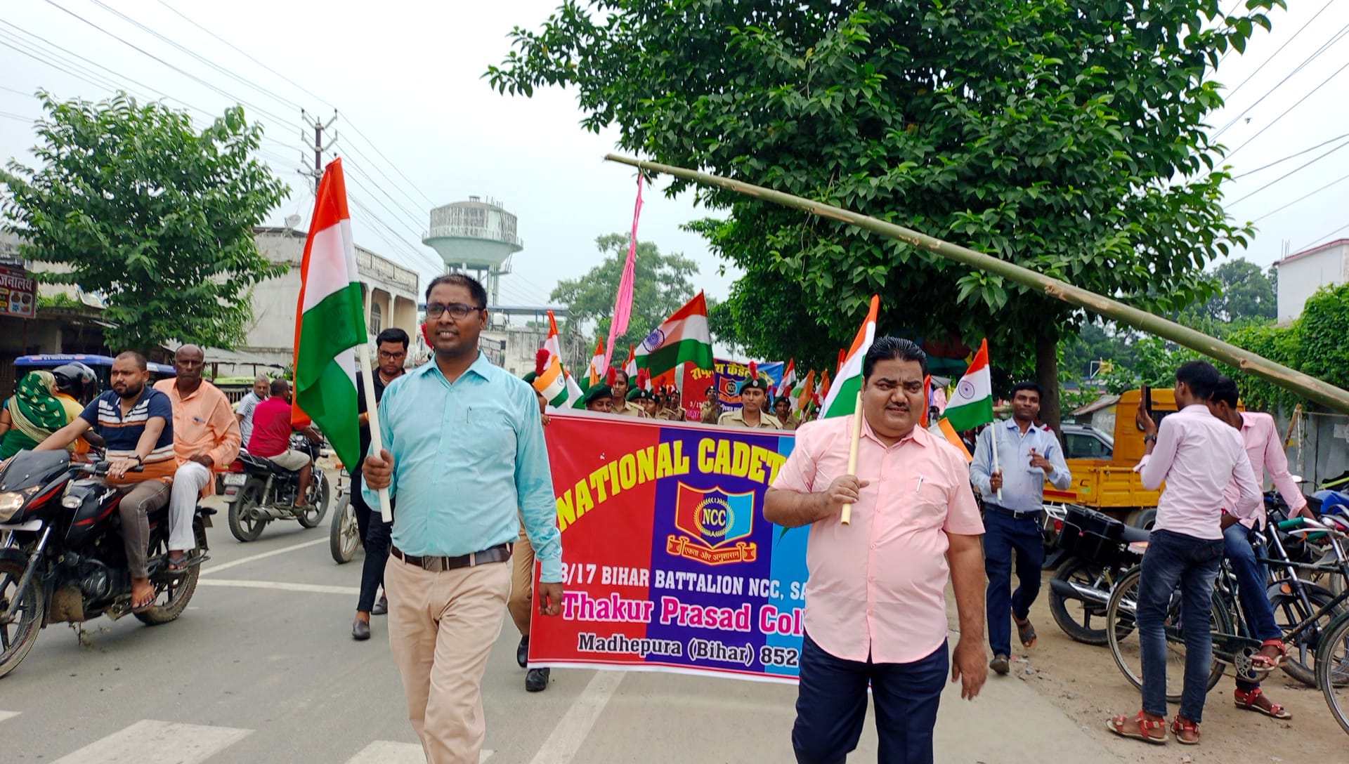 यह बात बीएनएमयू, मधेपुरा के कुलपति प्रो. बी. एस. झा ने कही। वे मंगलवार को तिरंगा रैली में शामिल जनसमूह को संबोधित कर रहे थे। कार्यक्रम का आयोजन ठाकुर प्रसाद महाविद्यालय, मधेपुरा के राष्ट्रीय कैडेट कोर (एनसीसी) एवं राष्ट्रीय सेवा योजना (एनएसएस) के संयुक्त तत्वावधान में किया गया।