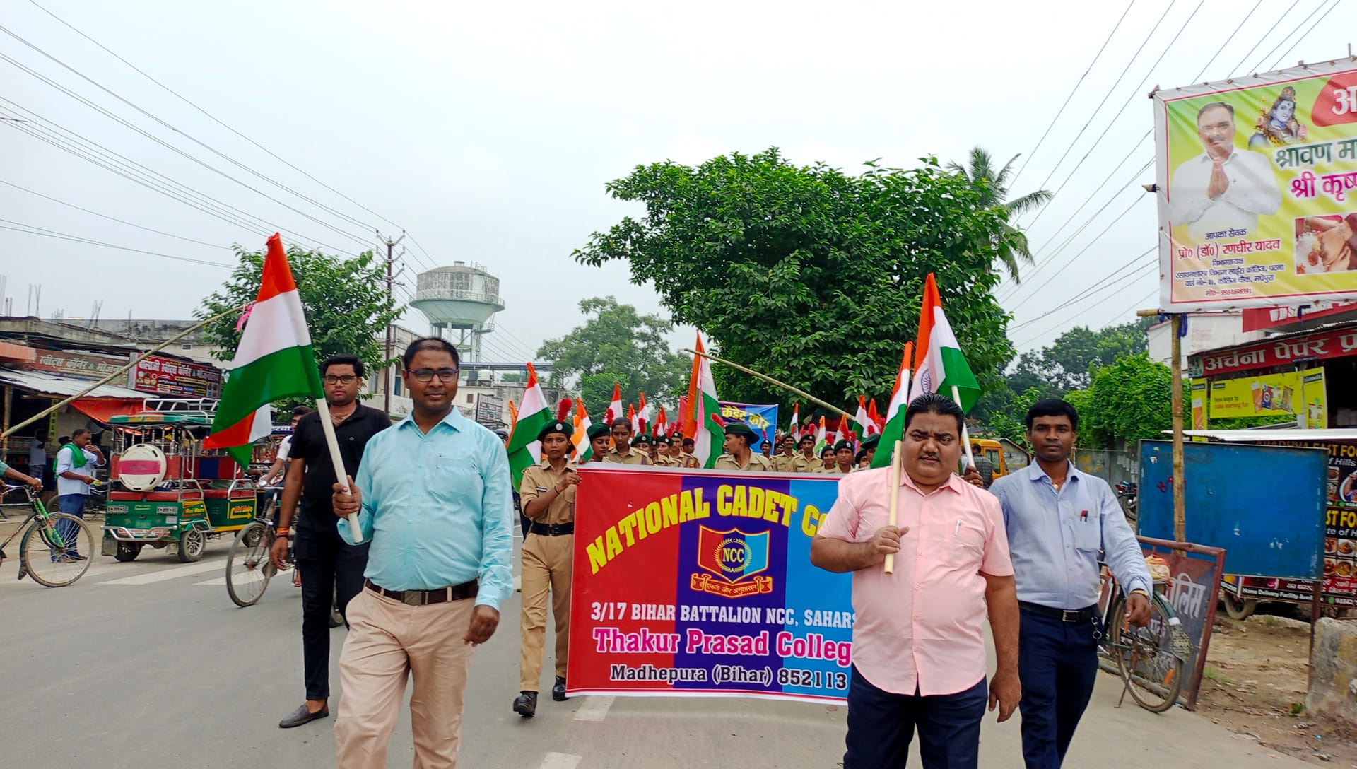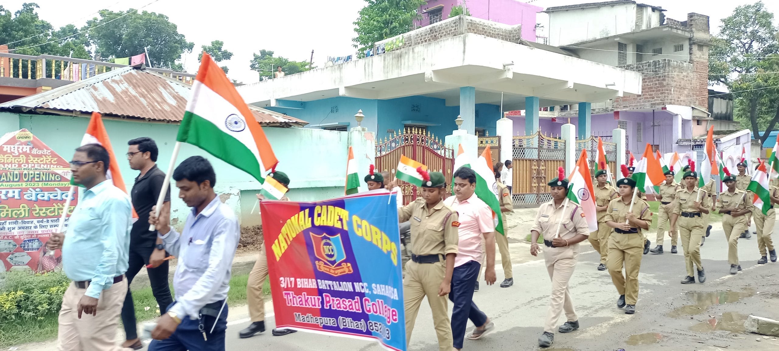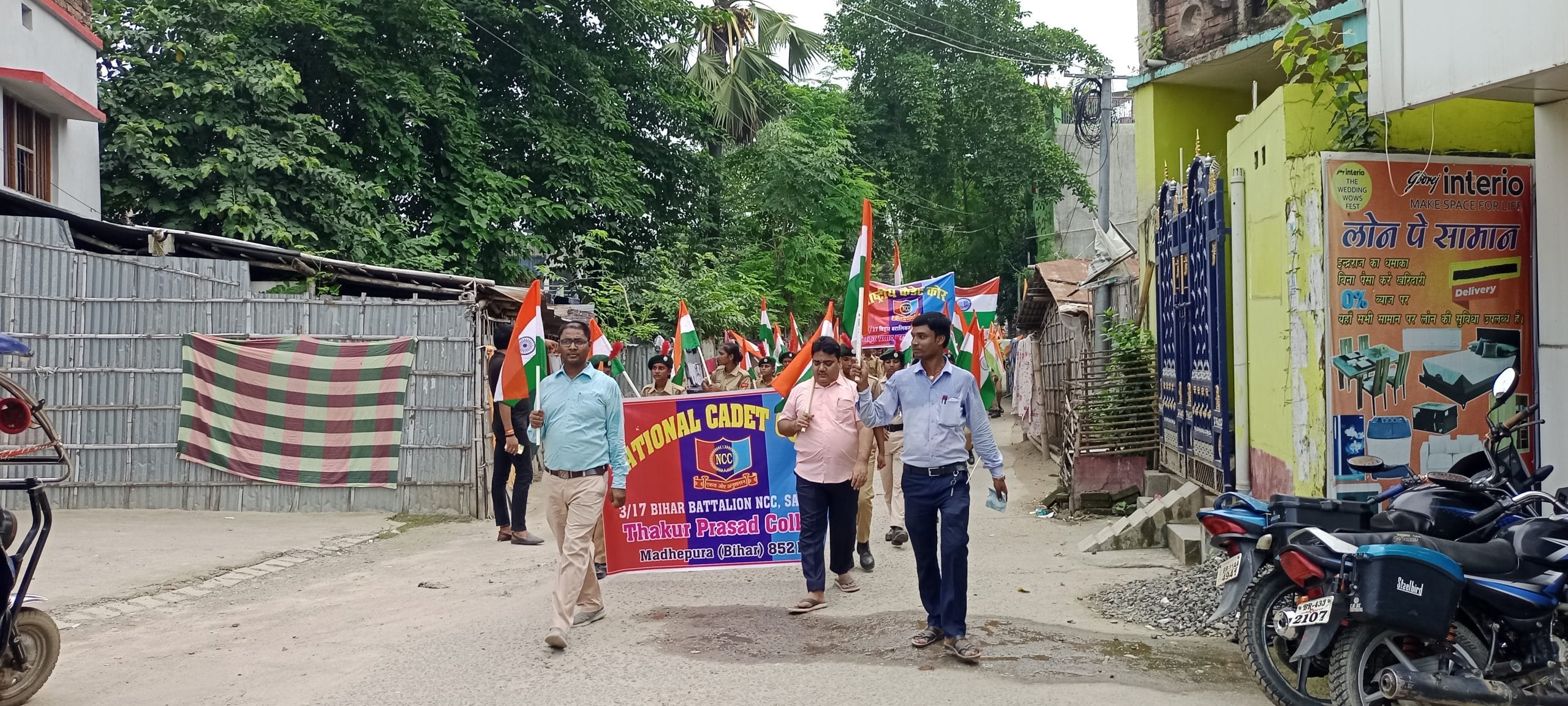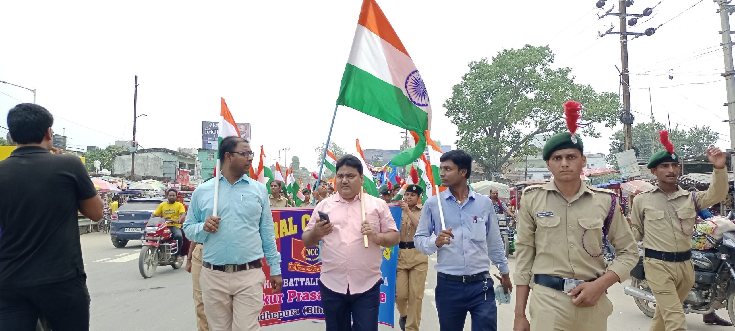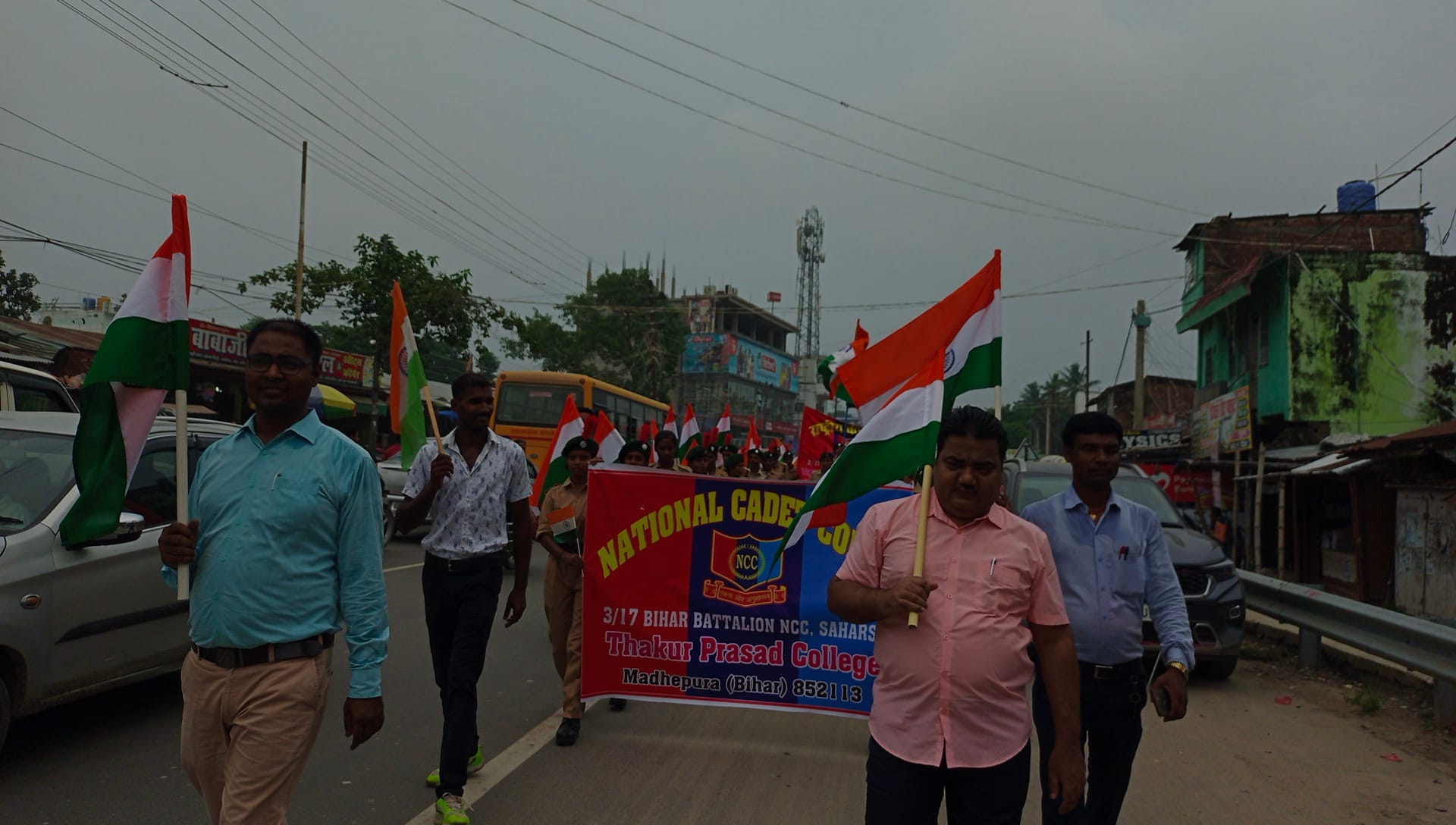 यह बात बीएनएमयू, मधेपुरा के कुलपति प्रो. बी. एस. झा ने कही। वे मंगलवार को तिरंगा रैली में शामिल जनसमूह को संबोधित कर रहे थे। कार्यक्रम का आयोजन ठाकुर प्रसाद महाविद्यालय, मधेपुरा के राष्ट्रीय कैडेट कोर (एनसीसी) एवं राष्ट्रीय सेवा योजना (एनएसएस) के संयुक्त तत्वावधान में किया गया।