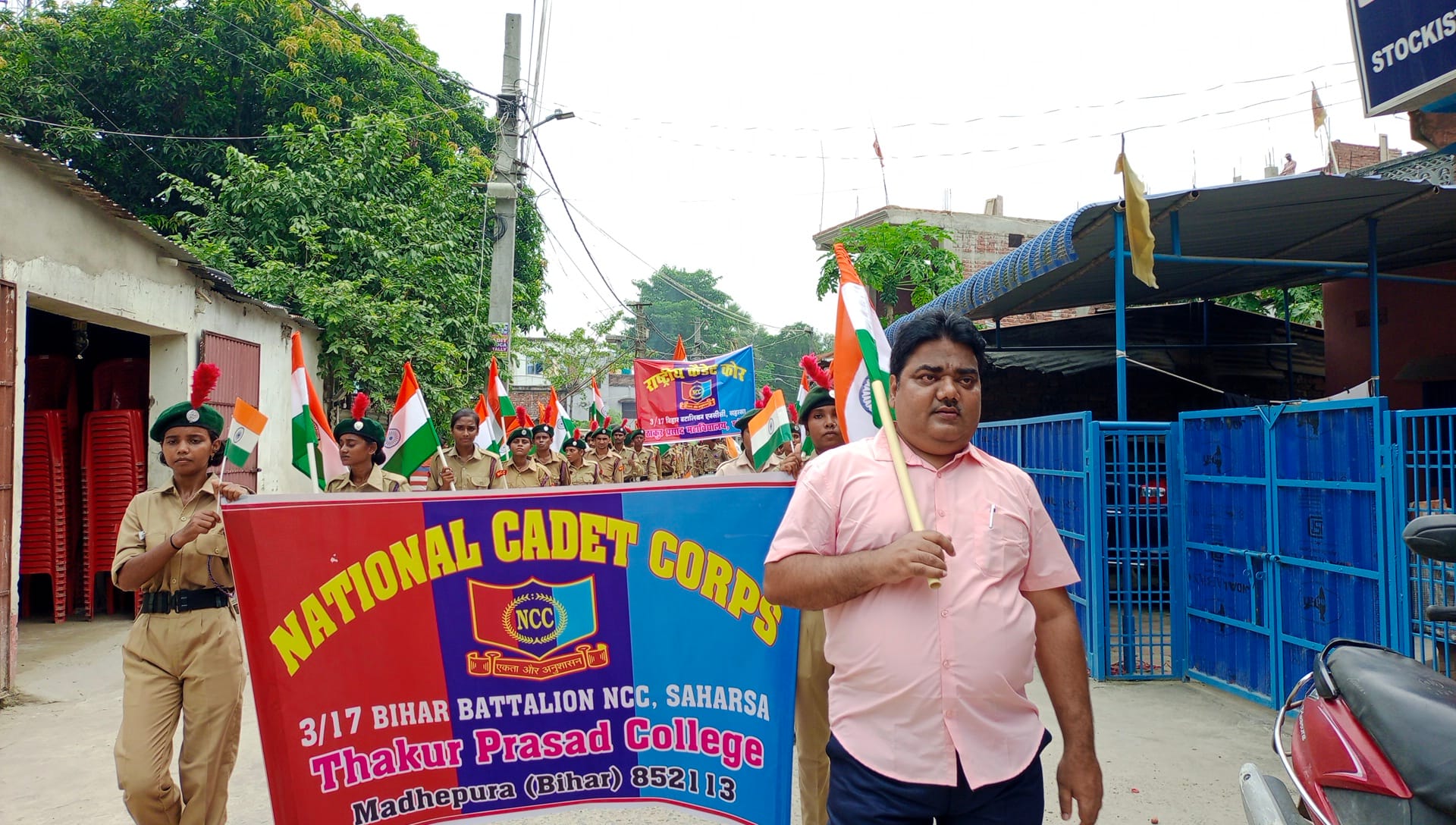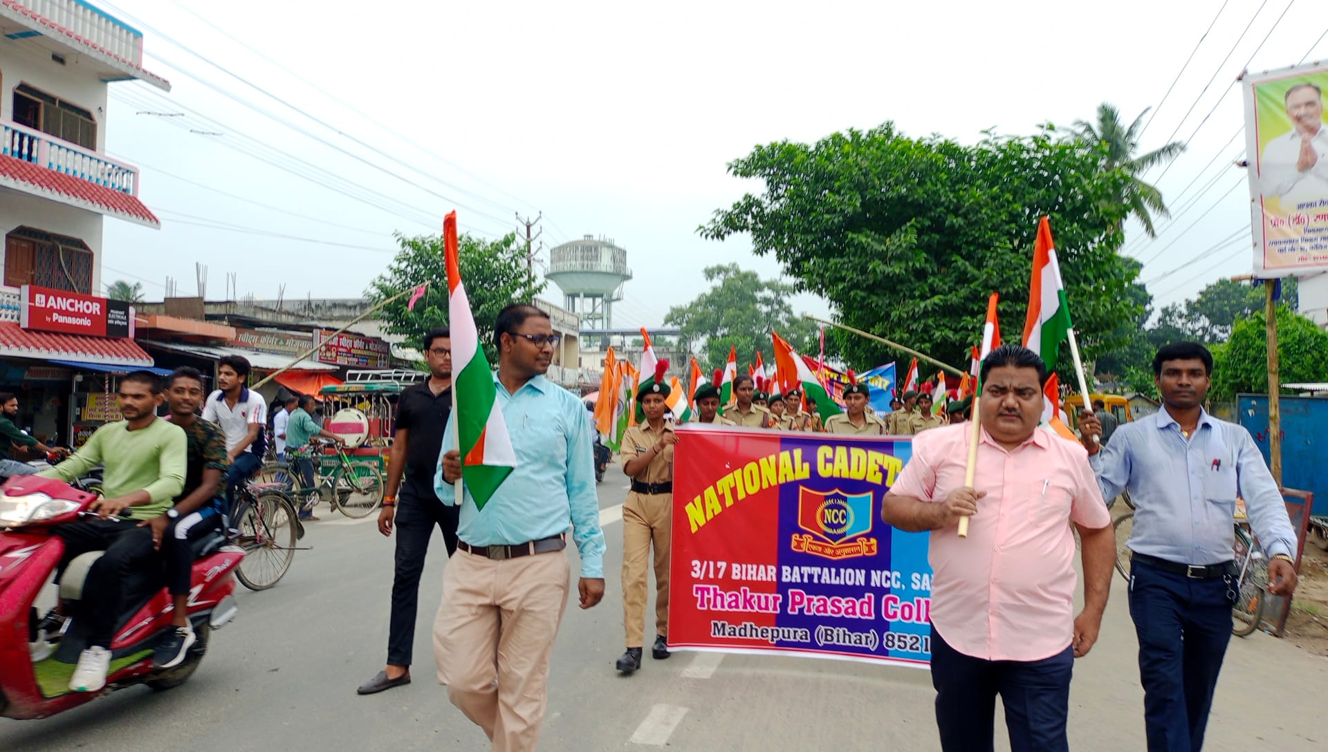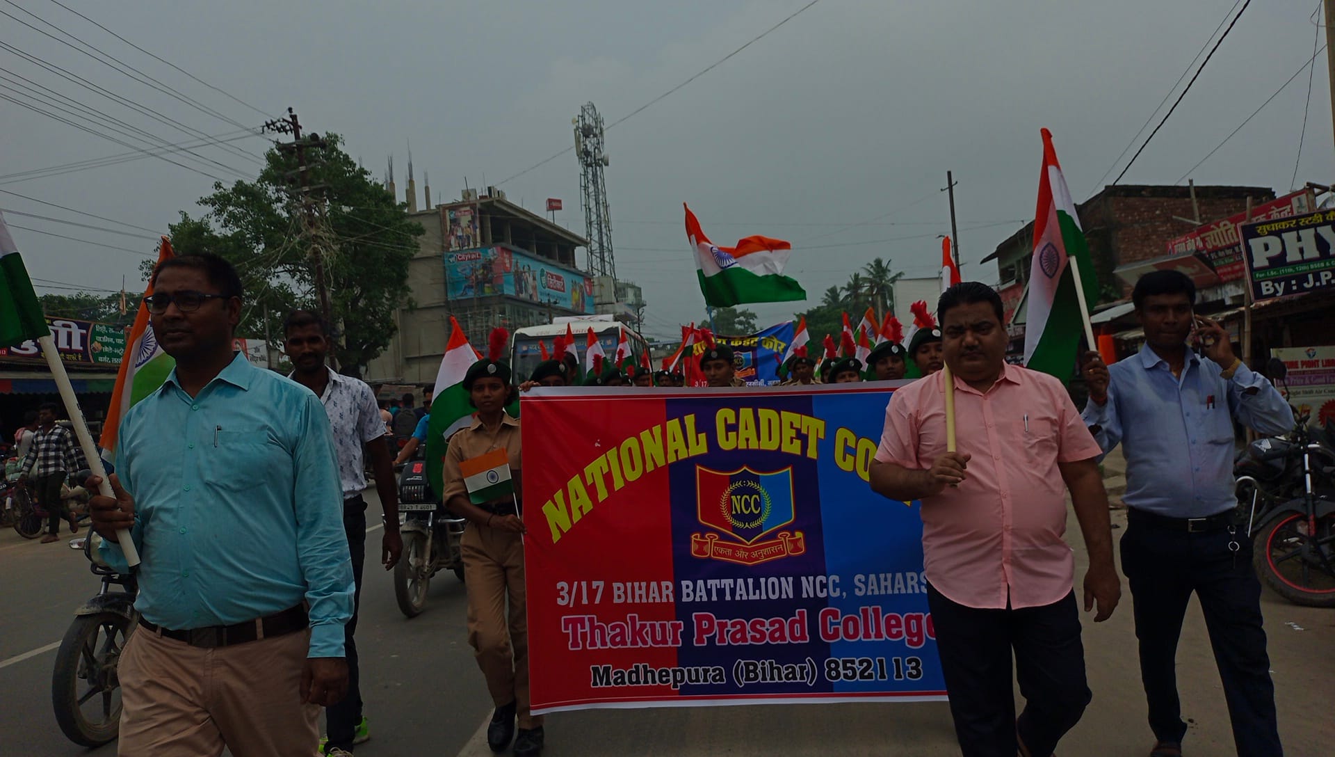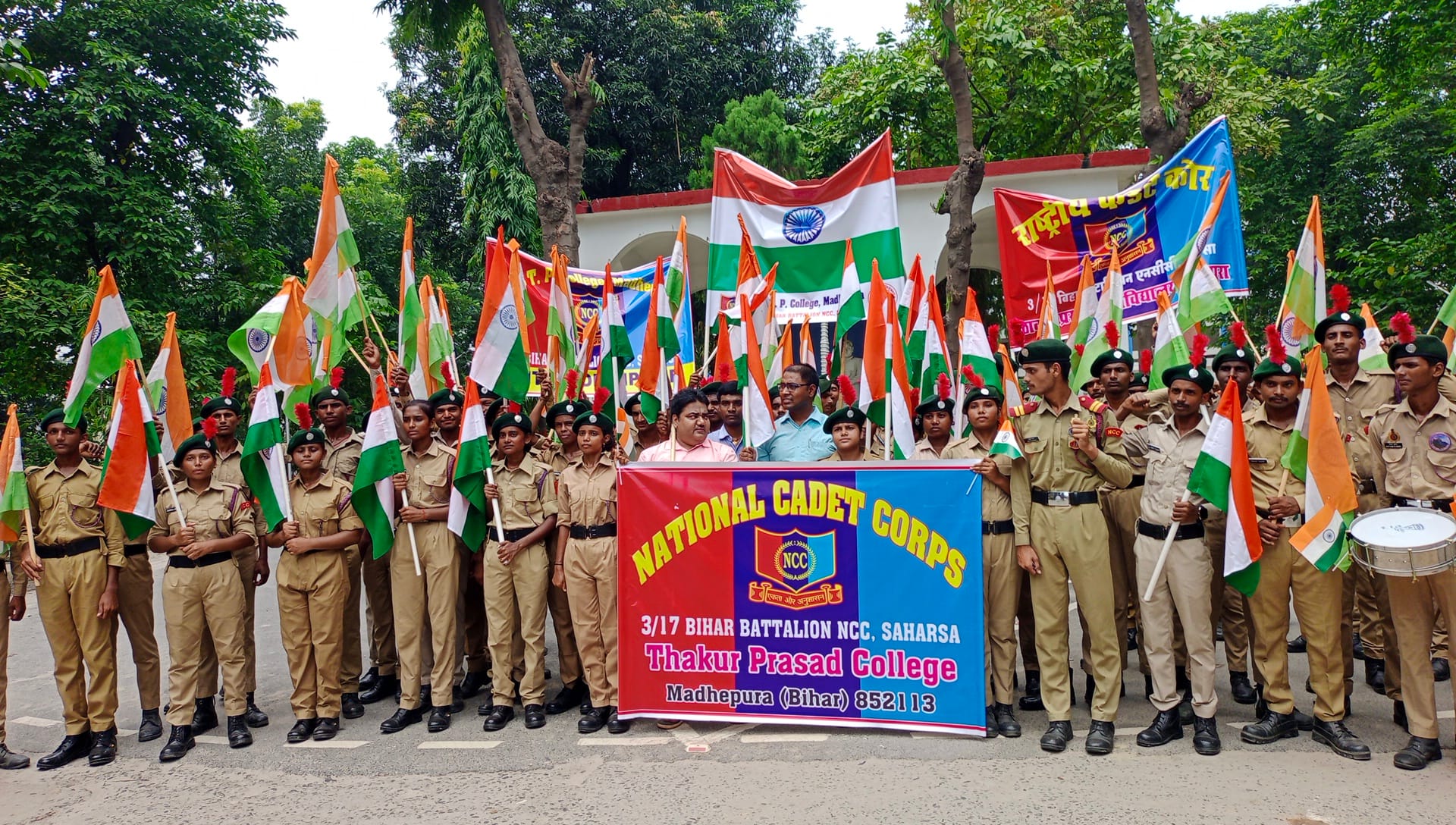 यह बात बीएनएमयू, मधेपुरा के कुलपति प्रो. बी. एस. झा ने कही। वे मंगलवार को तिरंगा रैली में शामिल जनसमूह को संबोधित कर रहे थे। कार्यक्रम का आयोजन ठाकुर प्रसाद महाविद्यालय, मधेपुरा के राष्ट्रीय कैडेट कोर (एनसीसी) एवं राष्ट्रीय सेवा योजना (एनएसएस) के संयुक्त तत्वावधान में किया गया।