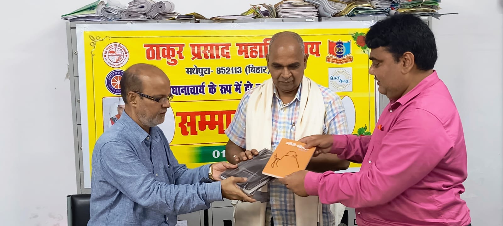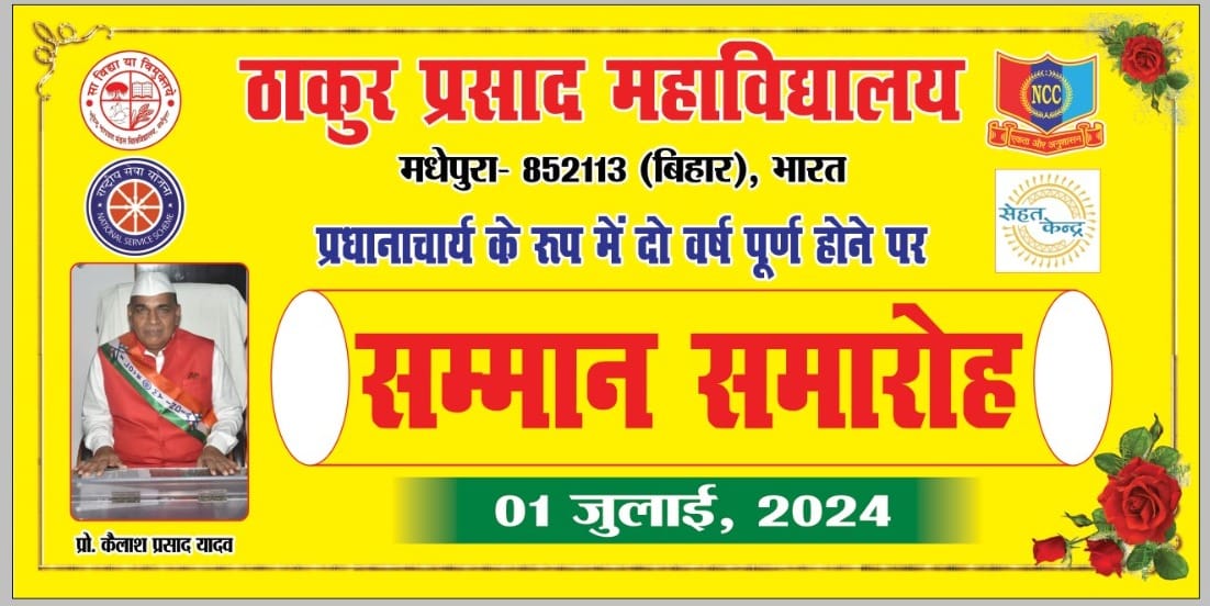 ठाकुर प्रसाद महाविद्यालय, मधेपुरा का गौरवशाली इतिहास है। हम उस स्वर्णिम इतिहास से प्रेरणा लेकर अपने वर्तमान को समुज्ज्वल बनाने का प्रयास कर रहे हैं।यह बात महाविद्यालय के प्रधानाचार्य प्रो. कैलाश प्रसाद यादव ने कही। वे प्रधानाचार्य के रूप में दो वर्ष पूरा होने पर महाविद्यालय में आयोजित सम्मान समारोह में बोल रहे थे। कार्यक्रम का आयोजन राष्ट्रीय सेवा योजना, राष्ट्रीय कैडेट कोर एवं सेहत केंद्र के संयुक्त तत्वावधान में किया गया