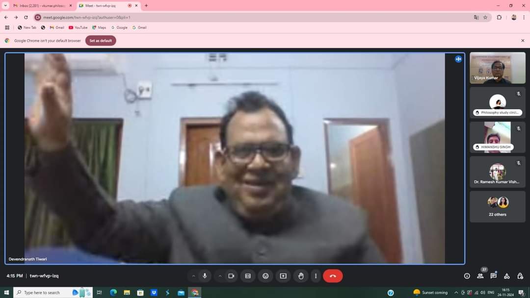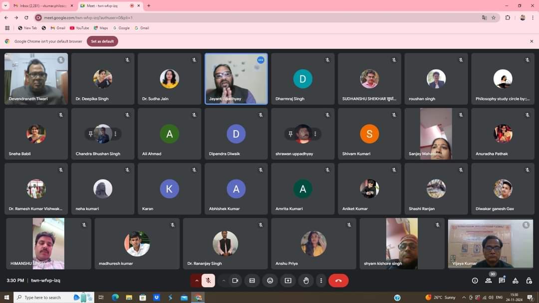 दिनांक 24.11.2024 को दर्शन विभाग लंगट सिंह महाविद्यालय, मुजफ्फरपुर और भारतीय दार्शनिक अनुसंधान परिषद्, शिक्षा मंत्रालय, नई दिल्ली के संयुक्त तत्त्वावधान में स्टडी सर्किल के अंतर्गत 8वाँ व्याख्यान प्राचार्य प्रो. (डॉ.) ओमप्रकाश राय जी के संरक्षकत्व में हुआ।