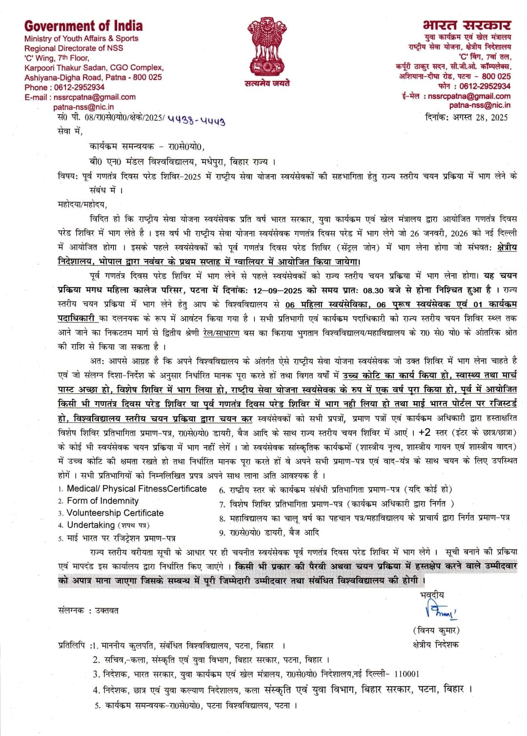 उन्होंने बताया कि पूर्व गणतंत्र दिवस परेड शिविर में भाग लेने से पहले स्वयंसेवकों को राज्य स्तरीय चयन प्रकिया में भाग लेना होगा। यह चयन प्रक्रिया मगध महिला कालेज परिसर, पटना में 12 सितंबर 2025 को समय प्रातः 08.30 बजे से होना निश्चित हुआ है। राज्य स्तरीय चयन प्रक्रिया में बीएनएमयू से 06 महिला स्वयंसेविका, 06 पुरूष स्वयंसेवक एवं 01 कार्यक्रम पदाधिकारी भाग लेंगे।