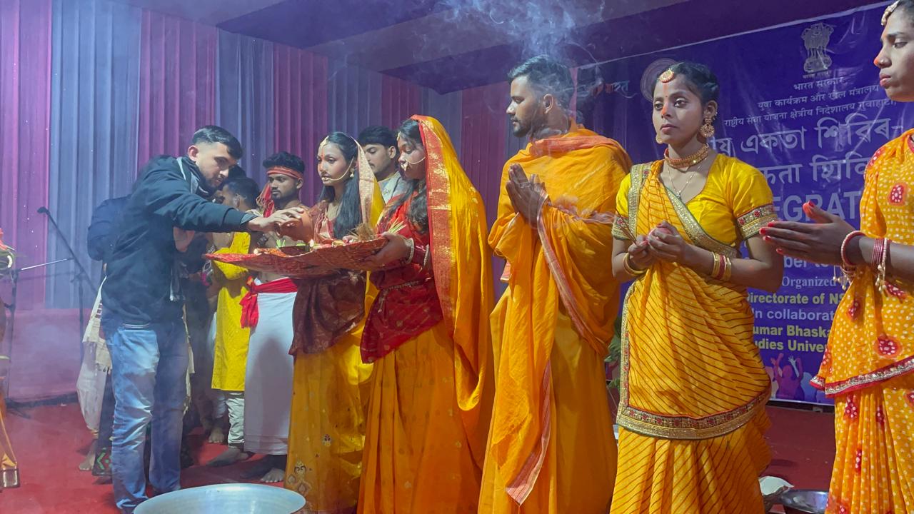 असम के नलवाड़ी स्थित कुमार भास्कर वर्म संस्कृत पुरातनाध्ययन विश्वविद्यालय में आयोजित राष्ट्रीय एकता शिविर में भाग लेने के लिए पहुंचे हुए हैं। बिहार के भूपेंद्र नारायण मंडल विश्वविद्यालय मधेपुरा एवं पूर्णिया विश्वविद्यालय के 10 सदस्य टीम साथ दिवसीय राष्ट्रीय एकता शिविर के लिए उपर्युक्त विश्वविद्यालय पहुंची हुई है। बिहार की टीम ने अपने सांस्कृतिक कार्यक्रम की प्रस्तुति इतने संजीदा तरीके से दी की उपस्थिति उक्त विश्वविद्यालय के कुलपति सहित पूरे देश के अलग-अलग राज्यों से आए हुए प्रतिभागी और शिक्षकों ने खड़े होकर छठी मैया के जयकार लगाए।