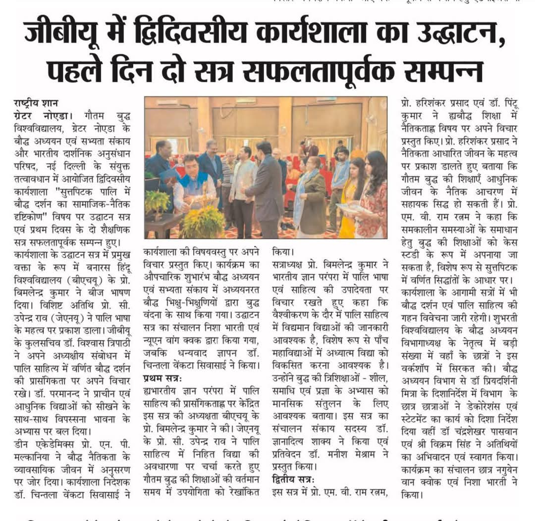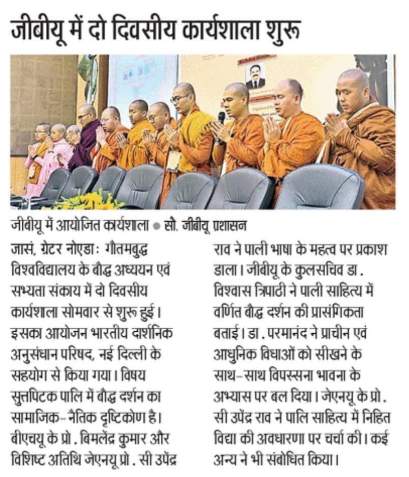 - कार्यशाला के उद्घाटन सत्र में प्रमुख वक्ता के रूप में बनारस हिंदू विश्वविद्यालय (बीएचयू) के प्रो. बिमलेन्द्र कुमार ने बीज भाषण दिया। विशिष्ट अतिथि प्रो. सी. उपेन्द्र राव (जेएनयू) ने पालि भाषा के महत्व पर प्रकाश डाला। जीबीयू के कुलसचिव डॉ. विश्वास त्रिपाठी ने अपने अध्यक्षीय संबोधन में पालि साहित्य में वर्णित बौद्ध दर्शन की प्रासंगिकता पर अपने विचार रखे। डॉ. परमानन्द ने प्राचीन एवं आधुनिक विद्याओं को सीखने के साथ-साथ विपस्सना भावना के अभ्यास पर बल दिया।