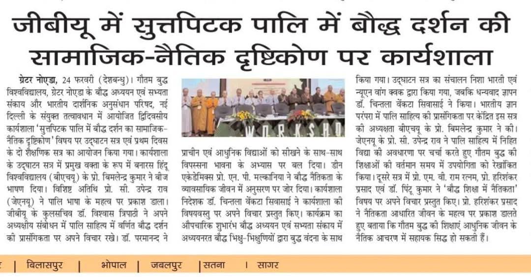 ग्रेटर नोएडा। गौतम बुद्ध विश्वविद्यालय, ग्रेटर नोएडा के बौद्ध अध्ययन एवं सभ्यता संकाय और भारतीय दार्शनिक अनुसंधान परिषद, नई दिल्ली के संयुक्त तत्वावधान में आयोजित द्विदिवसीय कार्यशाला “सुत्तपिटक पालि में बौद्ध दर्शन का सामाजिक-नैतिक दृष्टिकोण” विषय पर उद्घाटन सत्र एवं प्रथम दिवस के दो शैक्षणिक सत्र सफलतापूर्वक सम्पन्न हुए।