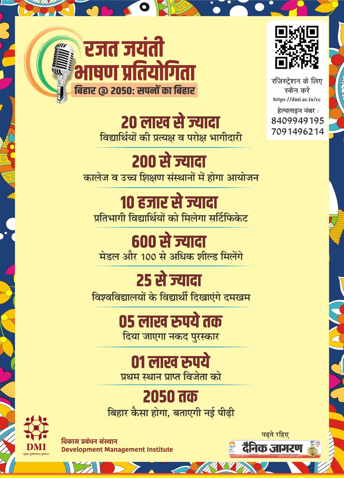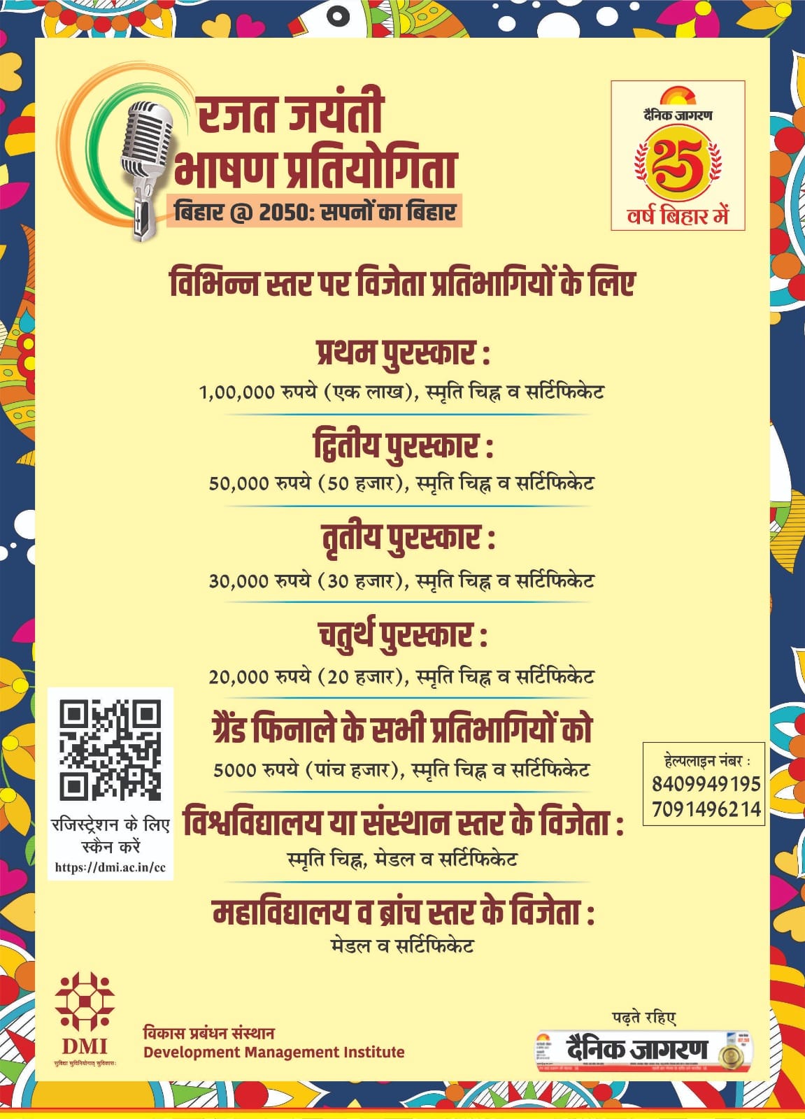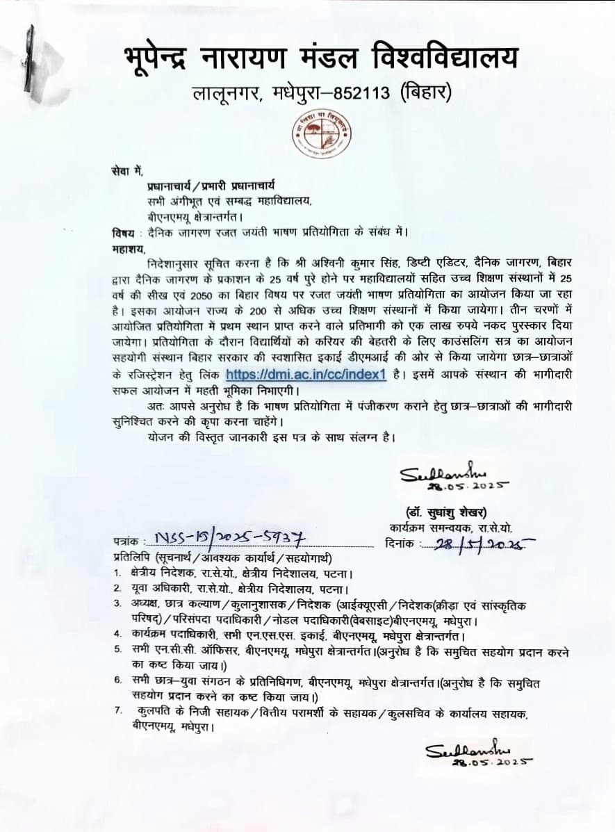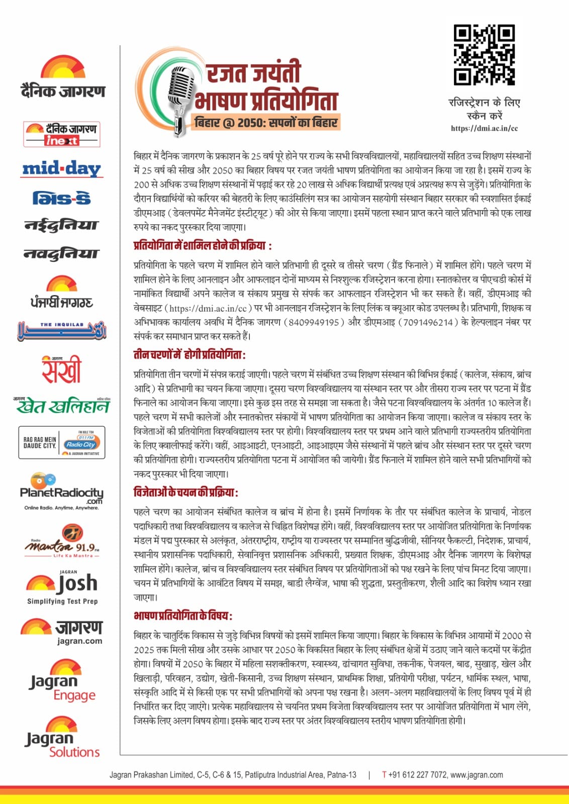 ठाकुर प्रसाद महाविद्यालय, मधेपुरा में 14 जून, 2025 (शनिवार) को एक प्रतिष्ठित समाचारपत्र दैनिक जागरण के सौजन्य से ग्रामीण स्वास्थ्य और 2050 का बिहार विषय पर रजत जयंती भाषण प्रतियोगिता का आयोजन सुनिश्चित है।