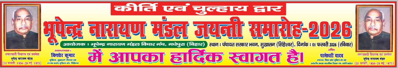 प्रखर समाजवादी चिंतक स्वतंत्रता सेनानी, विचारक भूपेंद्र नारायण मंडल की जयंती पर सिंहेश्वर प्रखंड के सुखासन पंचायत में होने वाले कार्यक्रम की तैयारी को शनिवार देर शाम as अंतिम रूप दे दिया गया।भूपेंद्र नारायण मंडल विचार मंच के सचिव परमेश्वरी यादव ने विचार मंच की ओर से जारी बयान में बताया कि भूपेंद्र जयंती समारोह को सफल बनाने में विचार मंच एवं स्थानीय मुखिया किशोर कुमार एवं उनकी टीम द्वारा लगभग एक महीने से चल रही तैयारी को अंतिम रूप दे दिया गया । सचिव परमेश्वरी यादव ने कार्यक्रम में