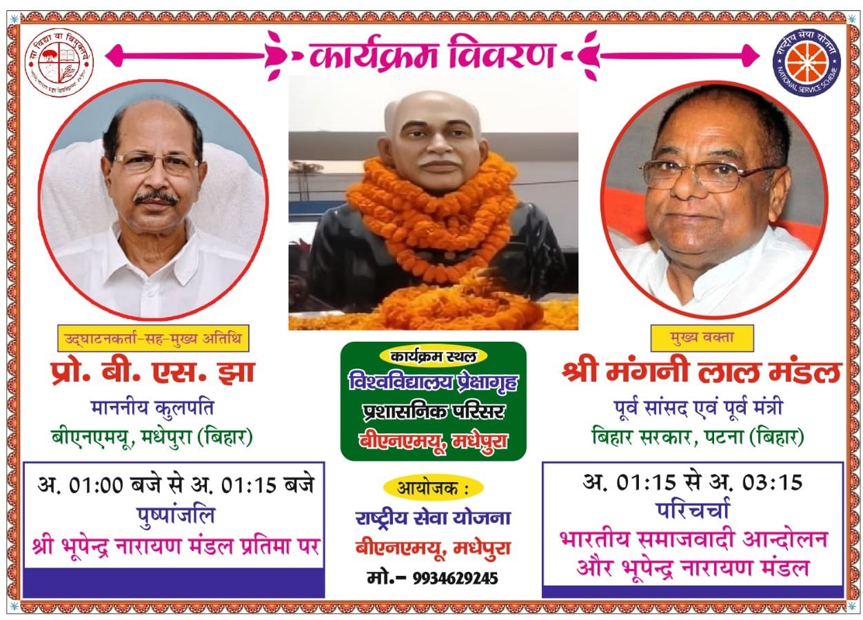 सुप्रसिद्ध समाजवादी चिंतक एवं पूर्व सांसद भूपेन्द्र नारायण मंडल की 51 वीं पुण्यतिथि पर 2025 (गुरुवार) को स्मृति दिवस समारोह का आयोजन किया जाएगा। इसके तहत प्रशासनिक परिसर स्थित भूपेन्द्र प्रतिमा पर पुष्पांजलि अर्पित की जाएगी और विश्वविद्यालय ऑडिटोरियम में भारतीय समाजवादी आंदोलन और भूपेन्द्र नारायण मंडल विषय पर परिचर्चा का आयोजन किया जाएगा। यह जानकारी राष्ट्रीय सेवा योजना (एनएसएस) के कार्यक्रम समन्वयक डॉ. सुधांशु शेखर ने दी।