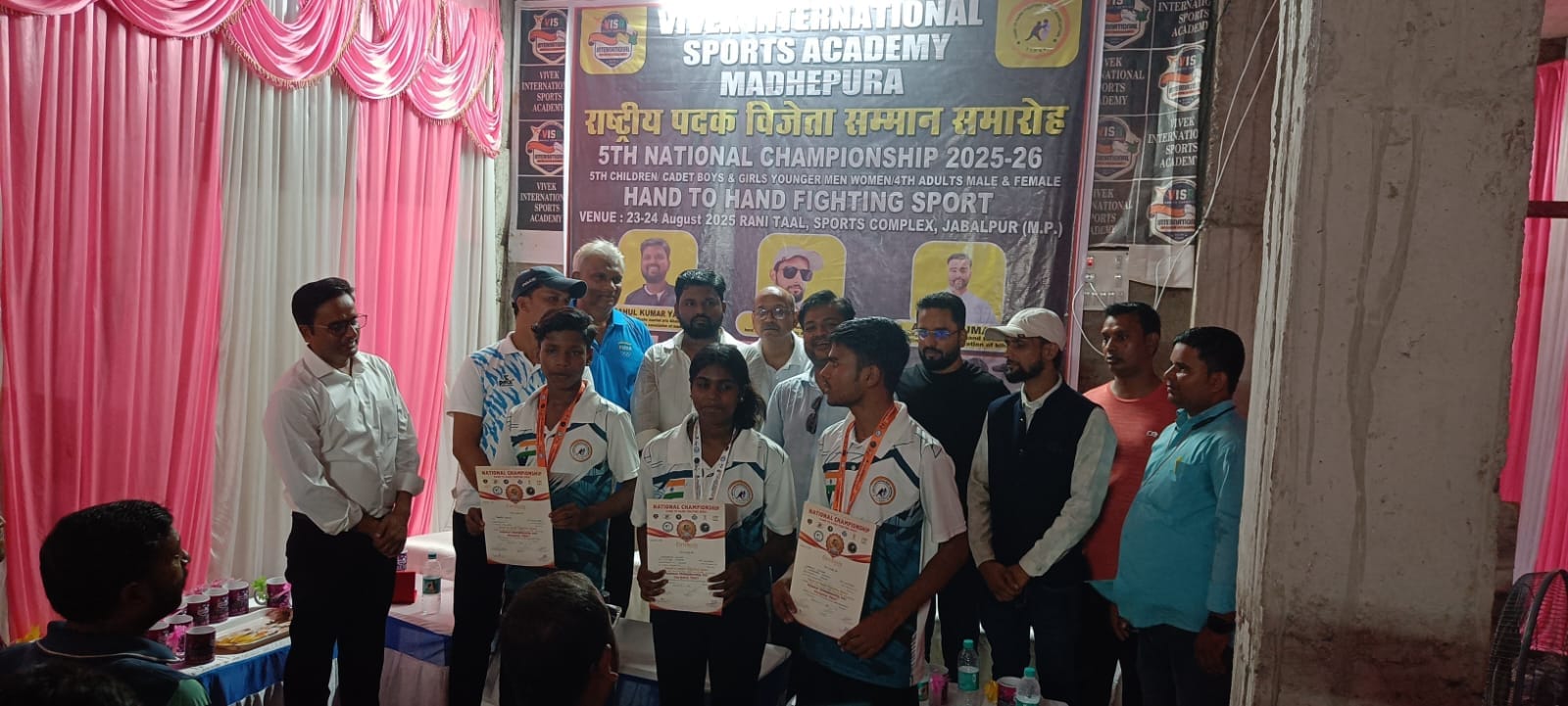 05वीं नेशनल हैंड टू हैंड फाइटिंग चैंपियनशिप स्पोर्ट्स 2025/26 जो कि 22 से 24 अगस्त 2025 तक मध्यप्रदेश के जबलपुर में आयोजित हुआ था इसमें विवेक इंटरनेशनल स्पोर्ट्स एकैडमी मधेपुरा के 02 बच्चे को गोल्ड मेडल प्राप्त हुआ है तथा 02 को सिल्वर मेडल प्राप्त हुआ है जो आगामी अंतरराष्ट्रीय प्रतियोगिता में भगा लेने काज़ीखिस्तान जाएंगे।