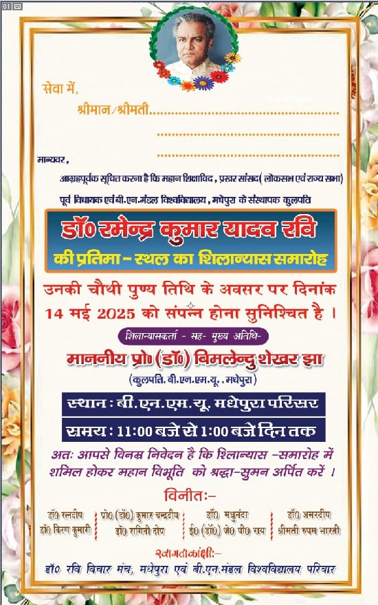 वे बुधवार को पूर्व सांसद (लोकसभा एवं राज्यसभा) एवं बीएनएमयू, मधेपुरा के संस्थापक कुलपति प्रोफेसर डॉ. रमेन्द्र कुमार यादव ‘रवि’ की प्रतिमा-स्थल के शिलान्यास समारोह में शिलान्यासकर्ता-सह- मुख्य अतिथि के रूप में बोल रहे थे। कार्यक्रम का आयोजन डॉ. रवि की चौथी पुण्यतिथि के अवसर पर डॉ. रवि विचार मंच तथा डॉ. रवि के परिजनों की ओर से विश्वविद्यालय के प्रशासनिक परिसर में किया गया। मालूम हो कि प्रतिमा का निर्माण डॉ. रवि के तीनों पुत्रों यथा- डॉ. रत्नदीप, प्रो. (डॉ.) कुमार चन्द्रदीप एवं डॉ. अमरदीप तथा पुत्री डॉ. मधुनंदा द्वारा किया जा रहा है।