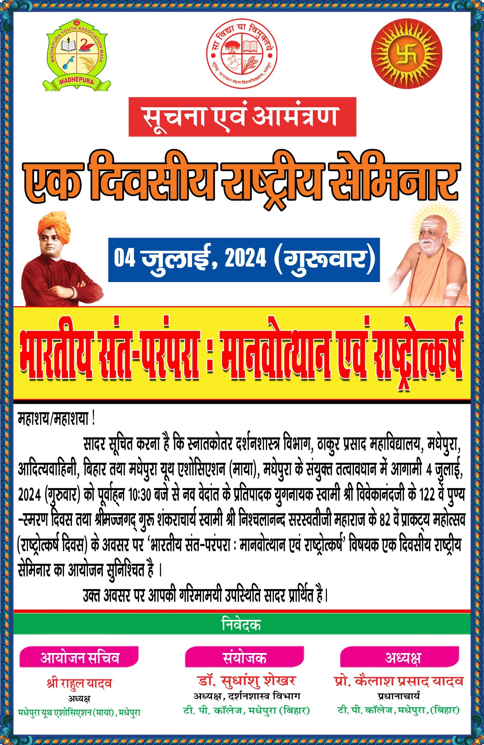 स्नातकोतर दर्शनशास्त्र विभाग, ठाकुर प्रसाद महाविद्यालय, मधेपुरा, आदित्यवाहिनी, बिहार तथा मधेपुरा यूथ एशोसिएशन (माया), मधेपुरा के संयुक्त तत्वावधान में आगामी 4 जुलाई, 2024 (गुरुवार) को एक राष्ट्रीय सेमिनार का आयोजन किया गया है। सेमिनार के संयोजक डॉ. सुधांशु शेखर ने बताया कि यह कार्यक्रम नव वेदांत के प्रतिपादक युगनायक स्वामी श्री विवेकानंदजी के 122 वें पुण्य स्मरण तथा श्रीमज्जगद् गुरु शंकराचार्य स्वामी श्री निश्चलानन्द सरस्वतीजी महाराज के 82 वें प्राकट्य महोत्सव (राष्ट्रोत्कर्ष दिवस) के अवसर पर आयोजित है। इसका विषय ‘भारतीय संत-परंपरा : मानवोत्थान एवं राष्ट्रोत्कर्ष’ रखा गया है।