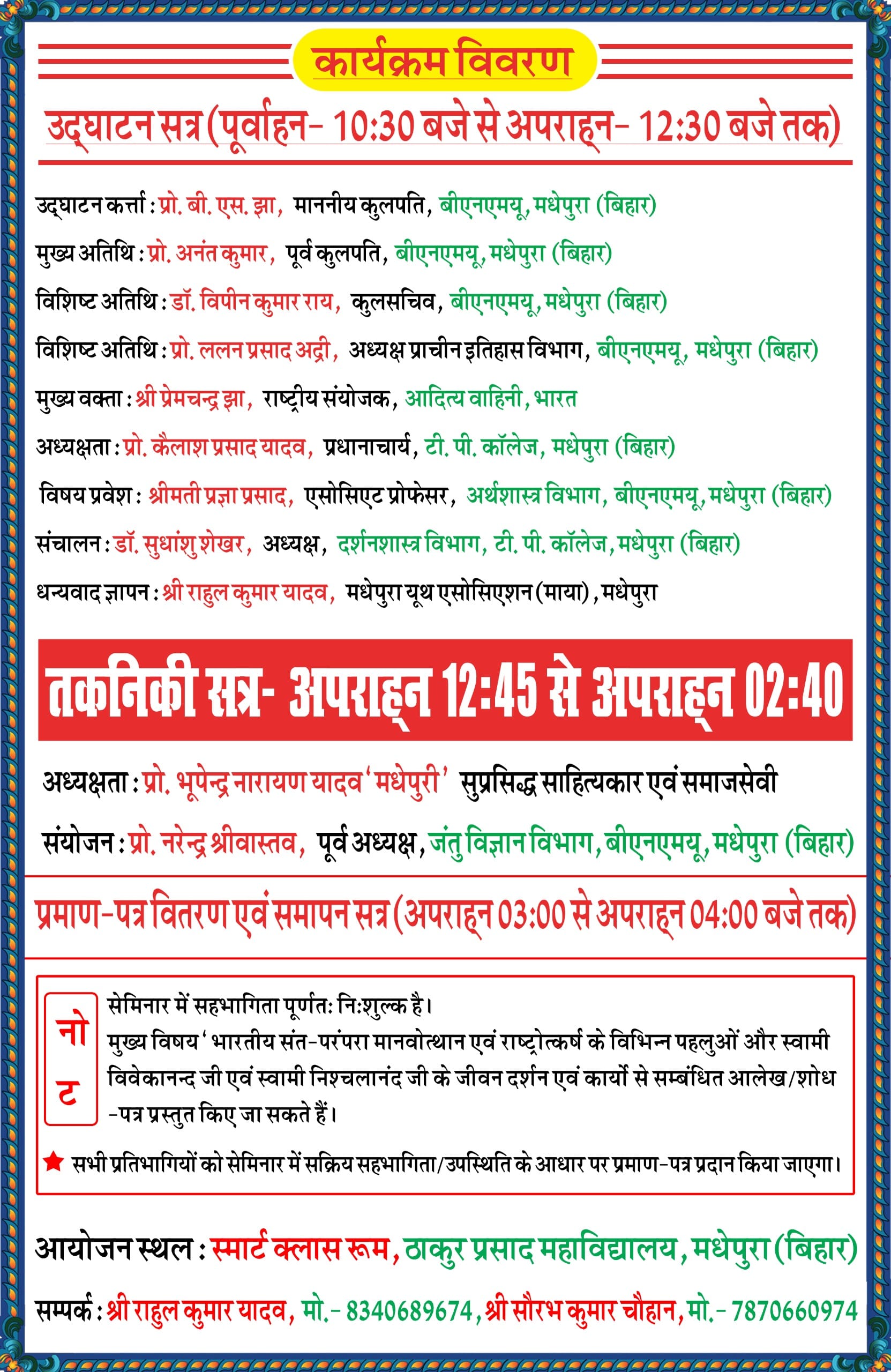 सेमिनार के आयोजन सचिव राहुल कुमार यादव ने बताया कि कार्यक्रम का उद्घाटन सत्र पूर्वाह्न 10:30 बजे से अपराह्न – 12:30 बजे तक आयोजित होगा। इसमें बीएनएमयू, मधेपुरा के कुलपति प्रो. बी. एस. झा, उद्घाटन कर्त्ता तथा आदित्य वाहिनी के राष्ट्रीय संयोजक प्रेमचन्द्र झा मुख्य वक्ता होंगे। इस अवसर पर पूर्व कुलपति प्रो. अनंत कुमार मुख्य अतिथि, कुलसचिव डॉ. विपिन कुमार राय विशिष्ट अतिथि तथा विकास पदाधिकारी प्रो. ललन प्रसाद अद्री सम्मानित अतिथि होंगे। कार्यक्रम की अध्यक्षता टी. पी. कॉलेज, मधेपुरा के प्रधानाचार्य प्रो. कैलाश प्रसाद यादव तथा विषय प्रवेश अर्थशास्त्र विभाग की एसोसिएट प्रोफेसर प्रज्ञा प्रसाद करेंगी।