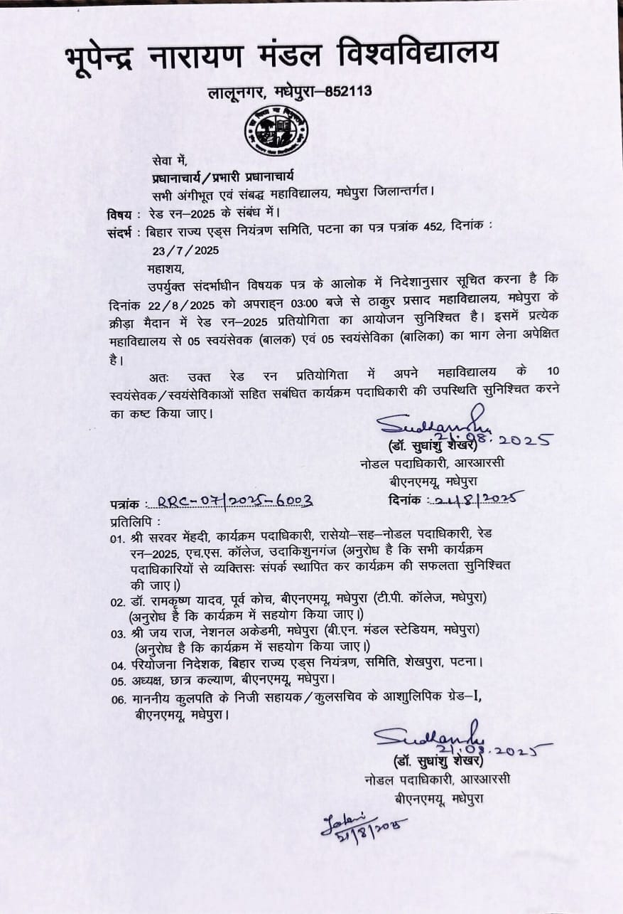 बिहार राज्य एड्स नियंत्रण समिति, पटना के तत्वावधान में ठाकुर प्रसाद महाविद्यालय, मधेपुरा के क्रीड़ा मैदान में 22 अगस्त, 2025 (शुक्रवार) को अपराह्न तीन बजे से रेड रन-2025 प्रतियोगिता का आयोजन सुनिश्चित है। इसमें प्रत्येक महाविद्यालय से पांच स्वयंसेवक (बालक) एवं पांच स्वयंसेविका (बालिका) का भाग लेना अपेक्षित है।