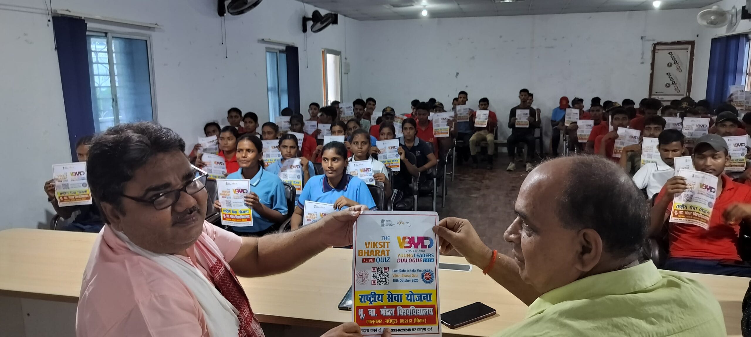 ठाकुर प्रसाद महाविद्यालय, मधेपुरा में शुक्रवार को राष्ट्रीय सेवा योजना (एनएसएस) तथा राष्ट्रीय कैडेट कोर (एनसीसी) के संयुक्त तत्वावधान में माय भारत पोर्टल एवं माय गवर्मेंट पोर्टल पर आयोजित विकसित भारत क्विज प्रतियोगिता (ऑनलाइन) में सामूहिक भागीदारी कार्यक्रम का आयोजन किया गया। कार्यक्रम की अध्यक्षता करते हुए प्रधानाचार्य प्रो. कैलाश प्रसाद यादव ने बताया कि इस प्रतियोगिता के लिए बिहार को एक लाख भागीदारी का लक्ष्य दिया गया है। अतः अंतिम तिथि पंद्रह अक्टूबर तक इसमें मधेपुरा की अधिकाधिक भागीदारी अपेक्षित है।