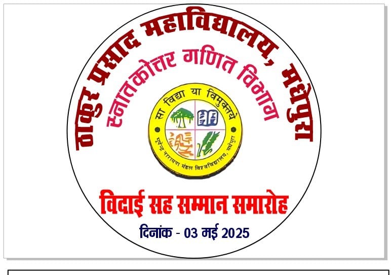 स्नातकोत्तर गणित विभाग, ठाकुर प्रसाद महाविद्यालय, मधेपुरा के तत्वावधान में 3 मई (शनिवार) को विदाई-सह- सम्मान समारोह का आयोजन किया गया है। विभागाध्यक्ष ले. गुड्डु कुमार ने बताया कि कार्यक्रम में प्रधानाचार्य प्रो. कैलाश प्रसाद यादव मुख्य अतिथि तथा दर्शनशास्त्र विभागाध्यक्ष डॉ. सुधांशु शेखर विशिष्ट अतिथि होंगे।