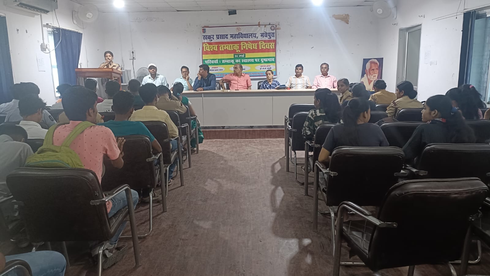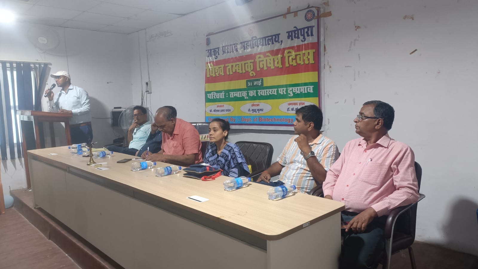 ठाकुर प्रसाद महाविद्यालय मधेपुरा में विश्व तम्बाकू निषेध दिवस के अवसर पर 3/17 बिहार बटालियन एनसीसी, राष्ट्रीय सेवा योजना, जैव प्रौद्योगिकी विभाग, बैचलर ऑफ कंप्यूटर एप्लीकेशन (बीसीए) के संयुक्त तत्वाधान में तंबाकू का स्वास्थ्य पर दुष्प्रभाव विषय एक परिचर्चा का आयोजन किया गया।