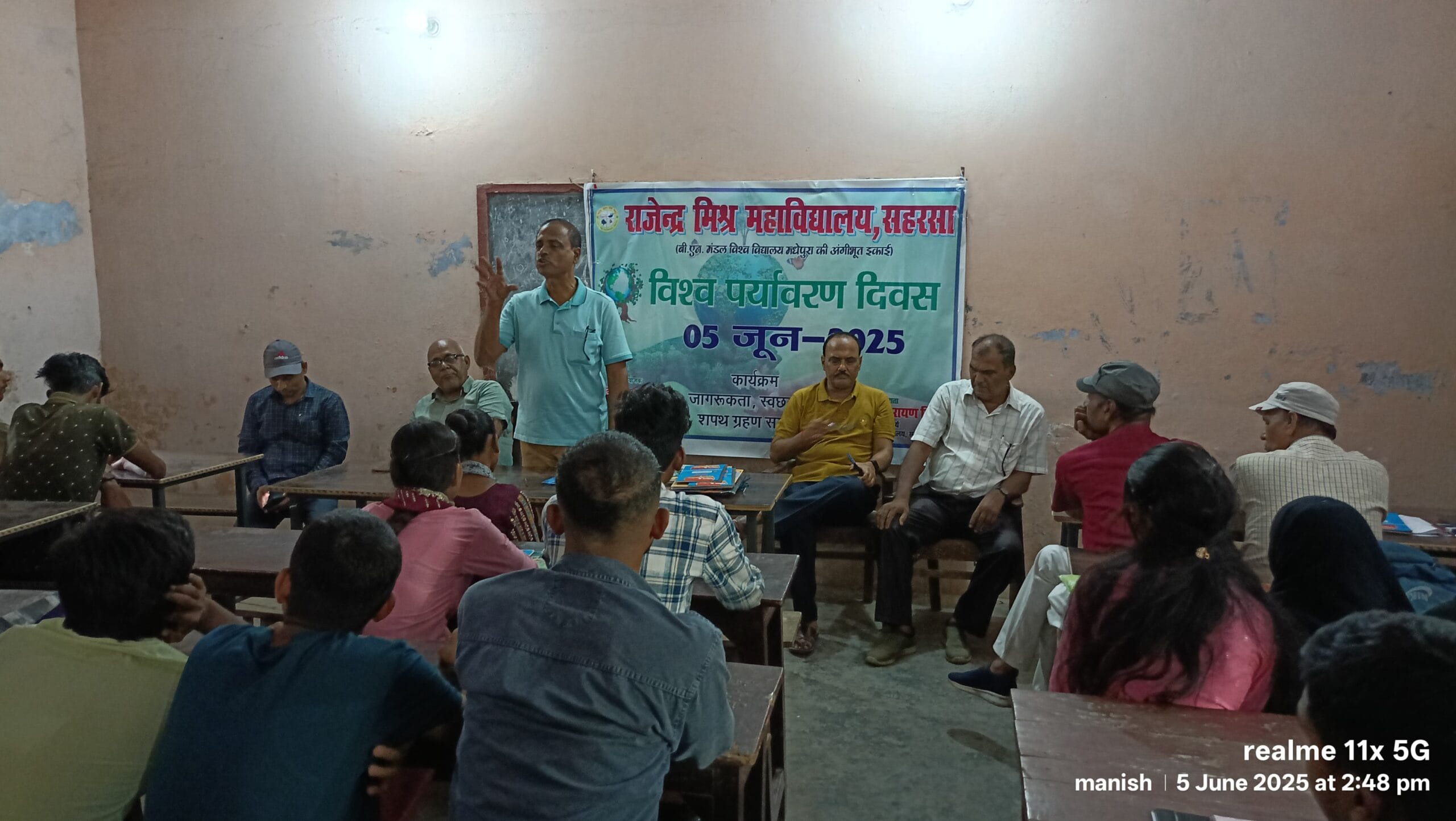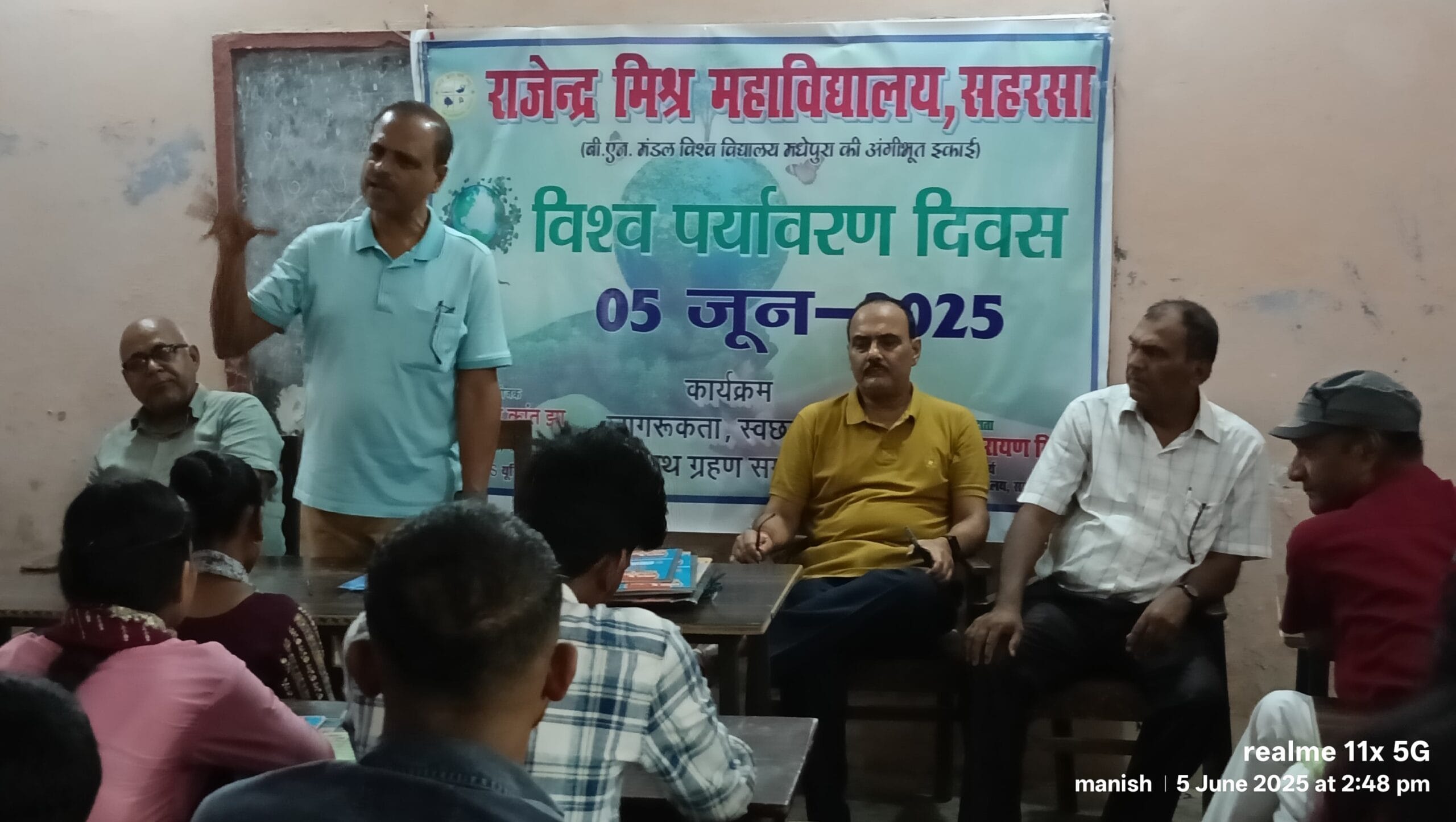 आज दिनांक 05.06.2025 को राजेंद्र मिश्र महाविद्यालय, सहरसा के राष्ट्रीय सेवा योजना एवं स्नातकोत्तर भूगोल विभाग के संयुक्त तत्वावधान में विश्व पर्यावरण दिवस के अवसर पर कार्यक्रम आयोजित कर पर्यावरण संरक्षण पर परिचर्चा की गयी। महाविद्यालय परिसर में वृक्षारोपण भी किया गया।