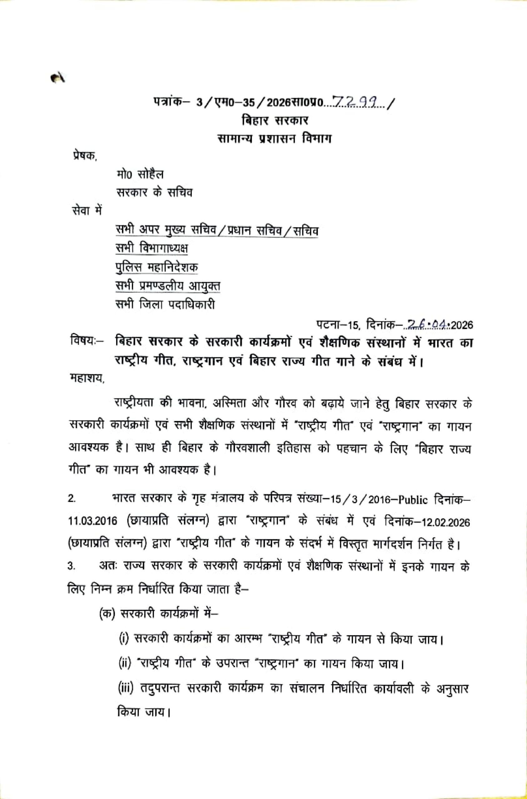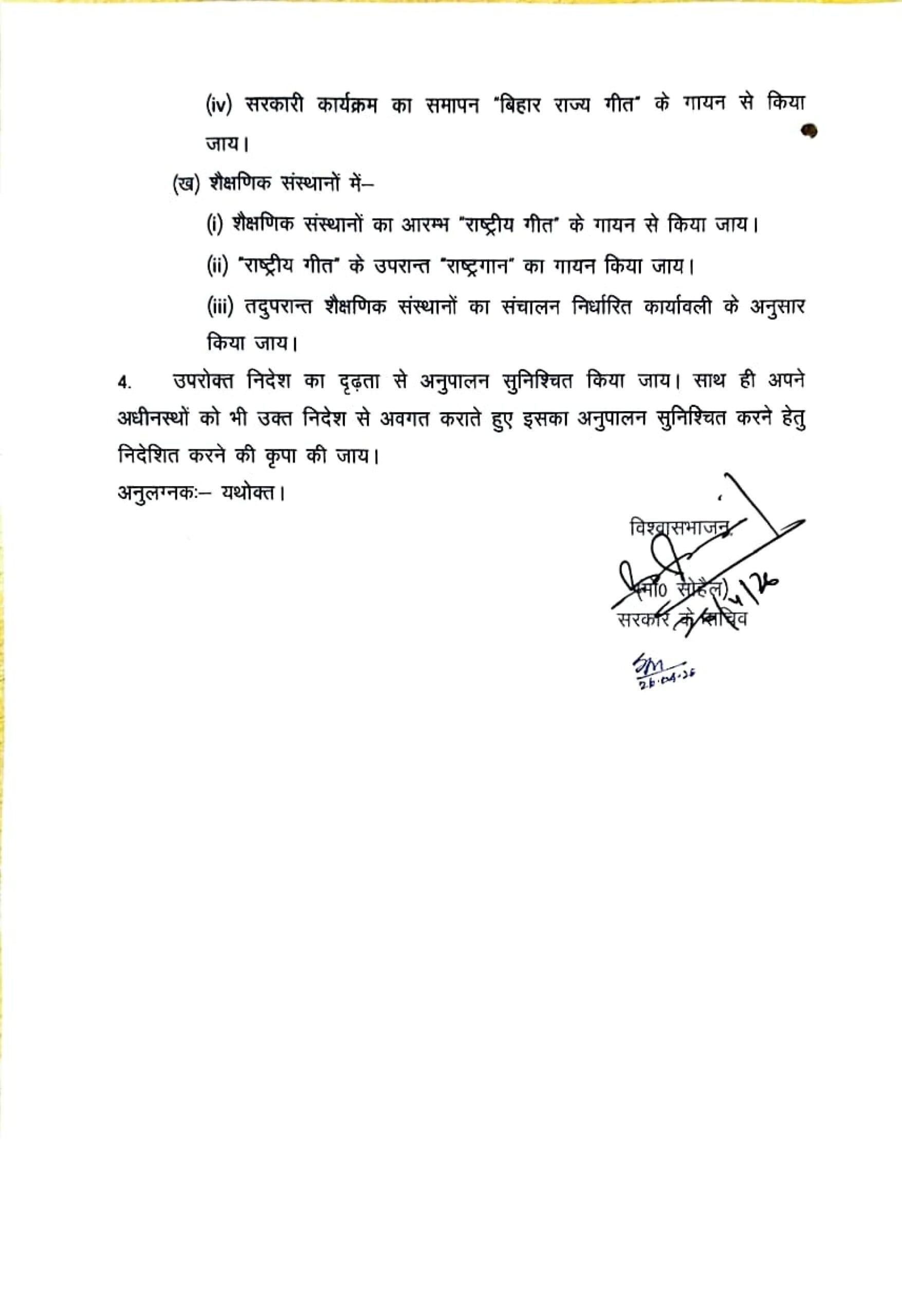 विषयः- बिहार सरकार के सरकारी कार्यक्रमों एवं शैक्षणिक संस्थानों में भारत का राष्ट्रीय गीत, राष्ट्रगान एवं बिहार राज्य गीत गाने के संबंध में। महाशय,