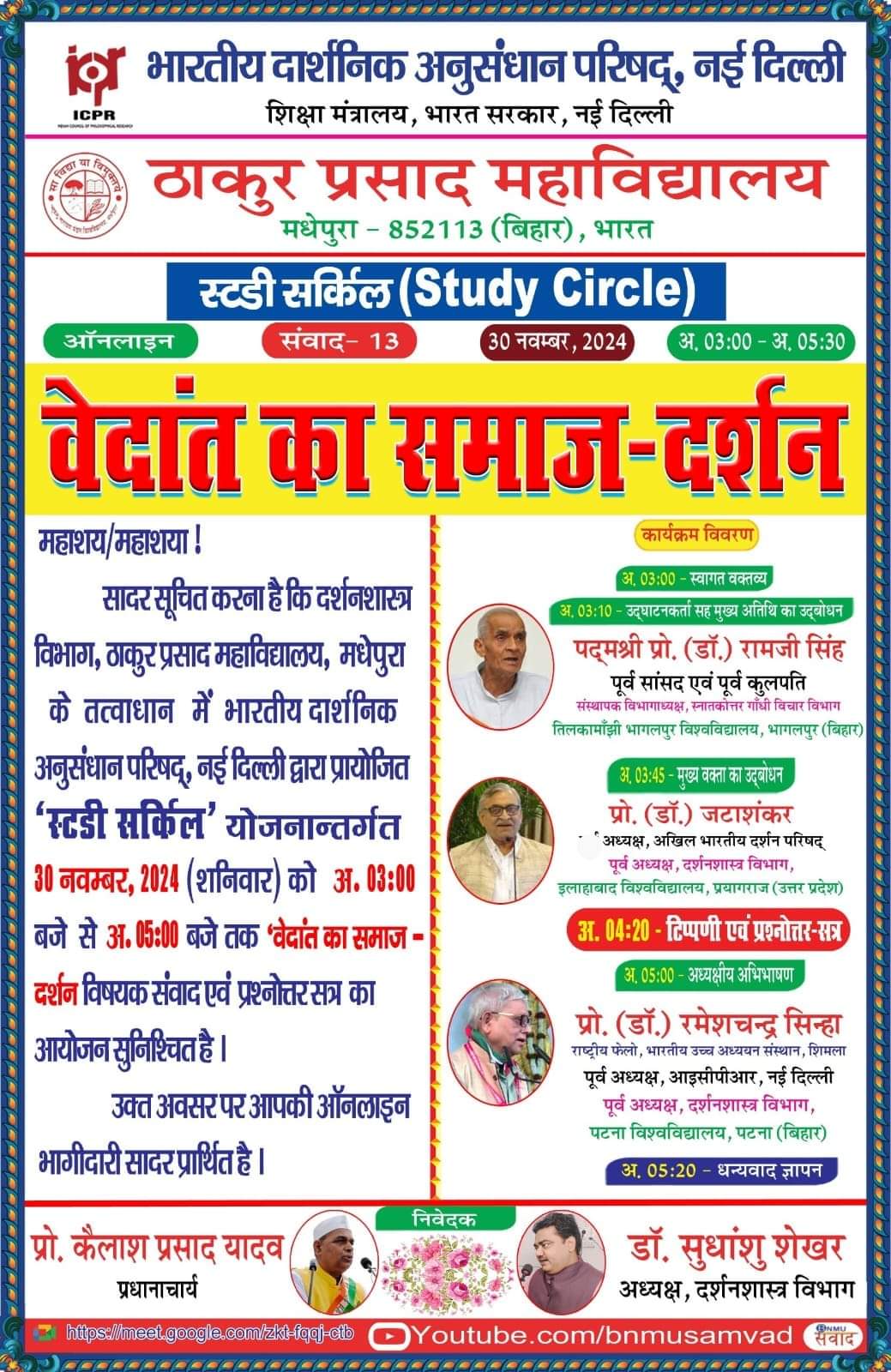 बीएनएमयू, मधेपुरा की अंगीभूत इकाई ठाकुर प्रसाद महाविद्यालय, मधेपुरा के तत्वावधान में शनिवार को भारत सरकार के शिक्षा मंत्रालय के अंतर्गत संचालित भारतीय दार्शनिक अनुसंधान परिषद्, नई दिल्ली द्वारा प्रायोजित ‘स्टडी सर्किल’ योजनान्तर्गत वेदांती समाज-दर्शन विषयक ऑनलाइन व्याख्यान का आयोजन किया गया।
