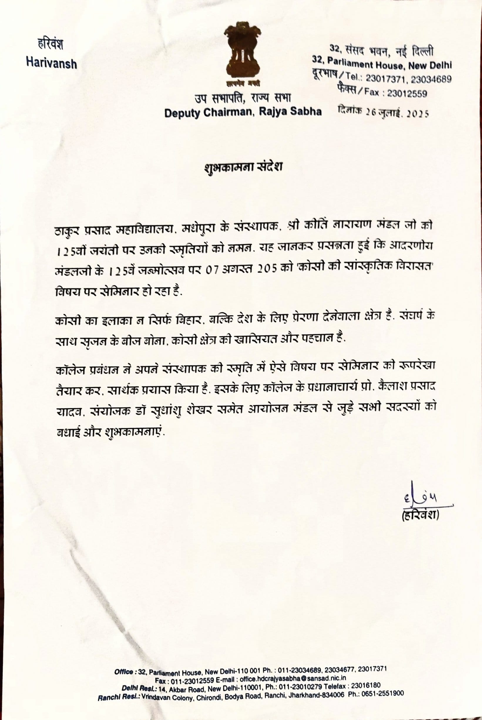 राज्यसभा के माननीय उपसभापति श्री हरिवंश जी ने कृपापूर्वक अपना शुभकामना-संदेश उपलब्ध कराया है। इसके लिए हम उनके प्रति आभार व्यक्त करते हैं।