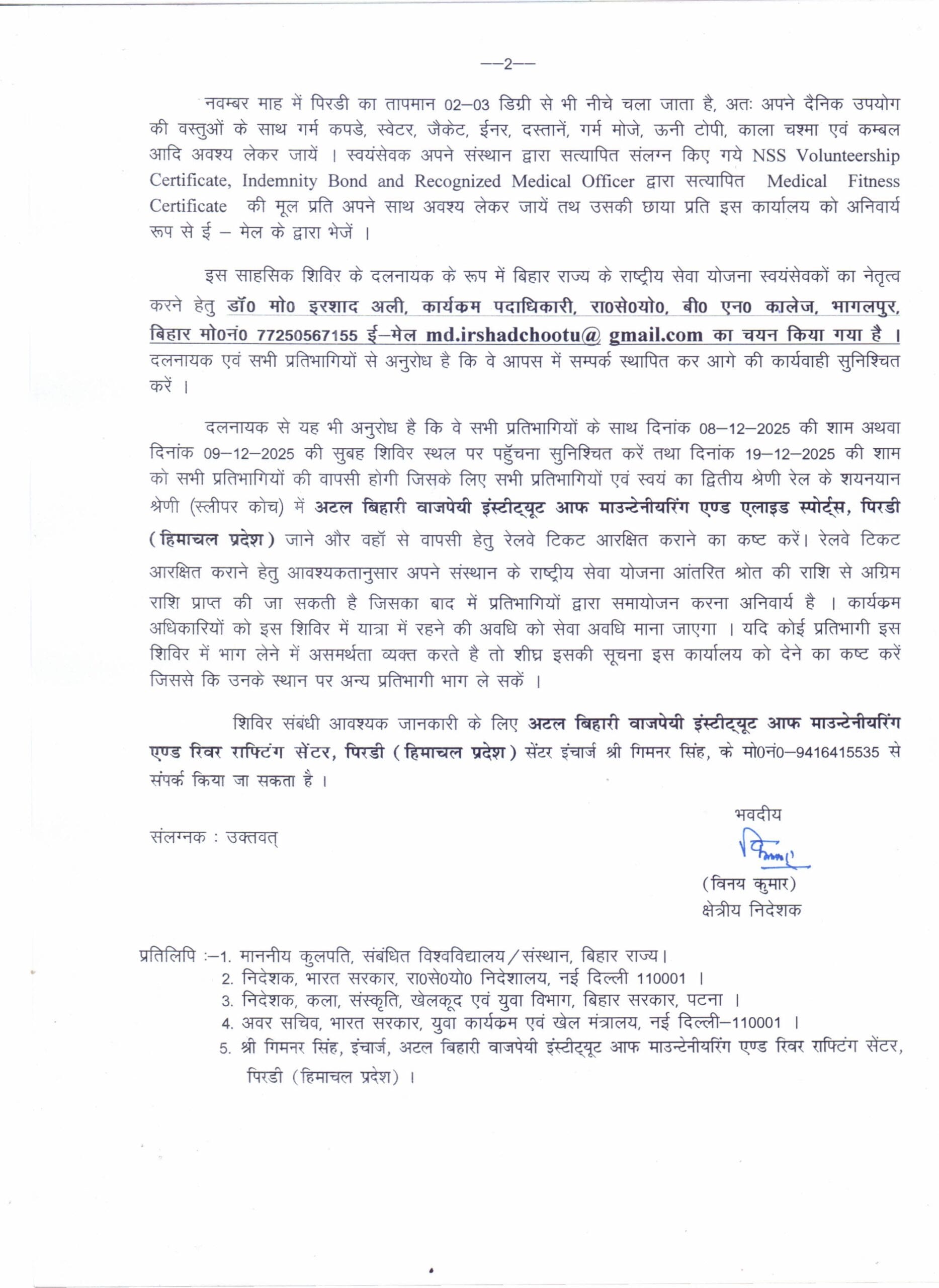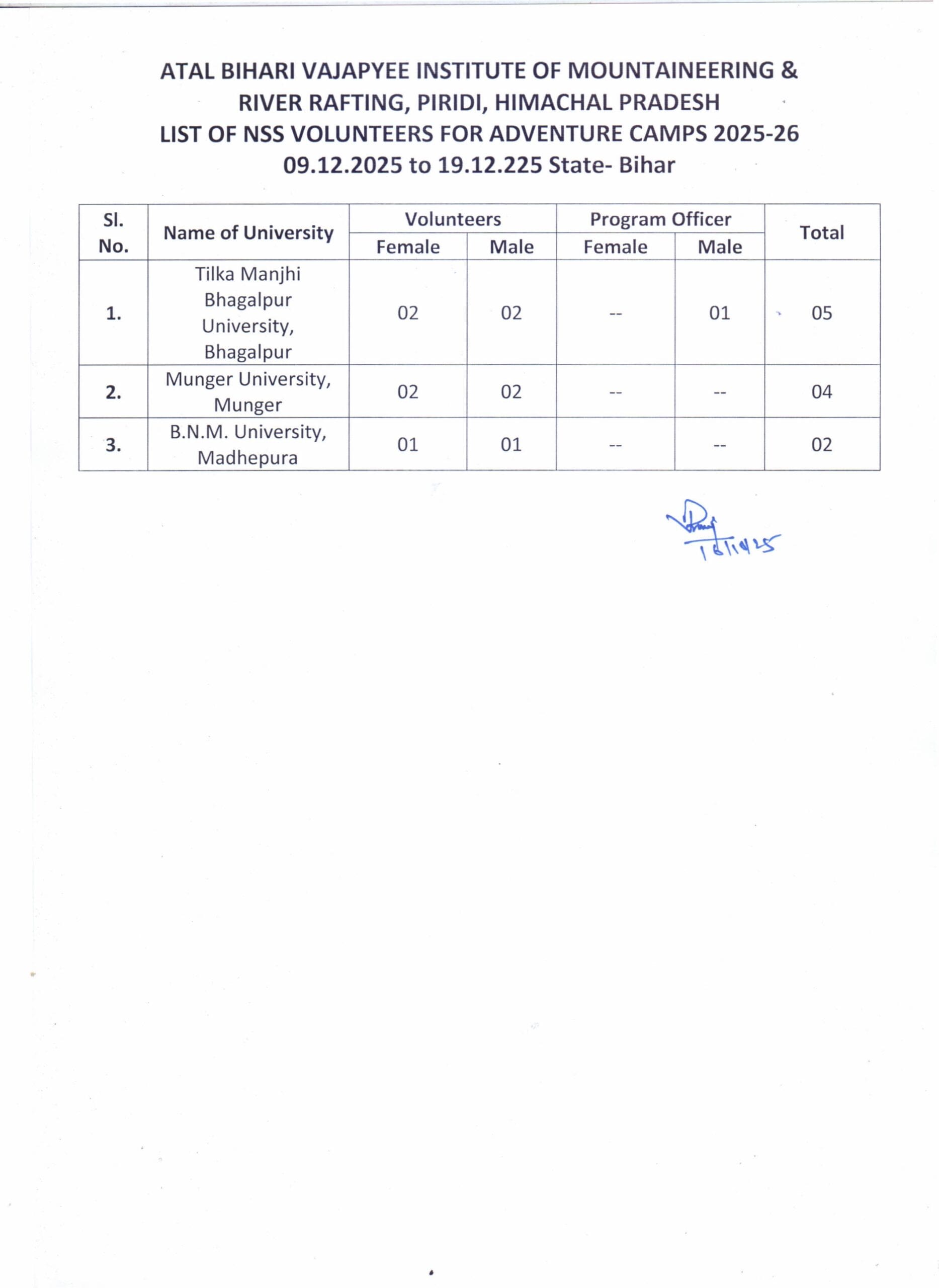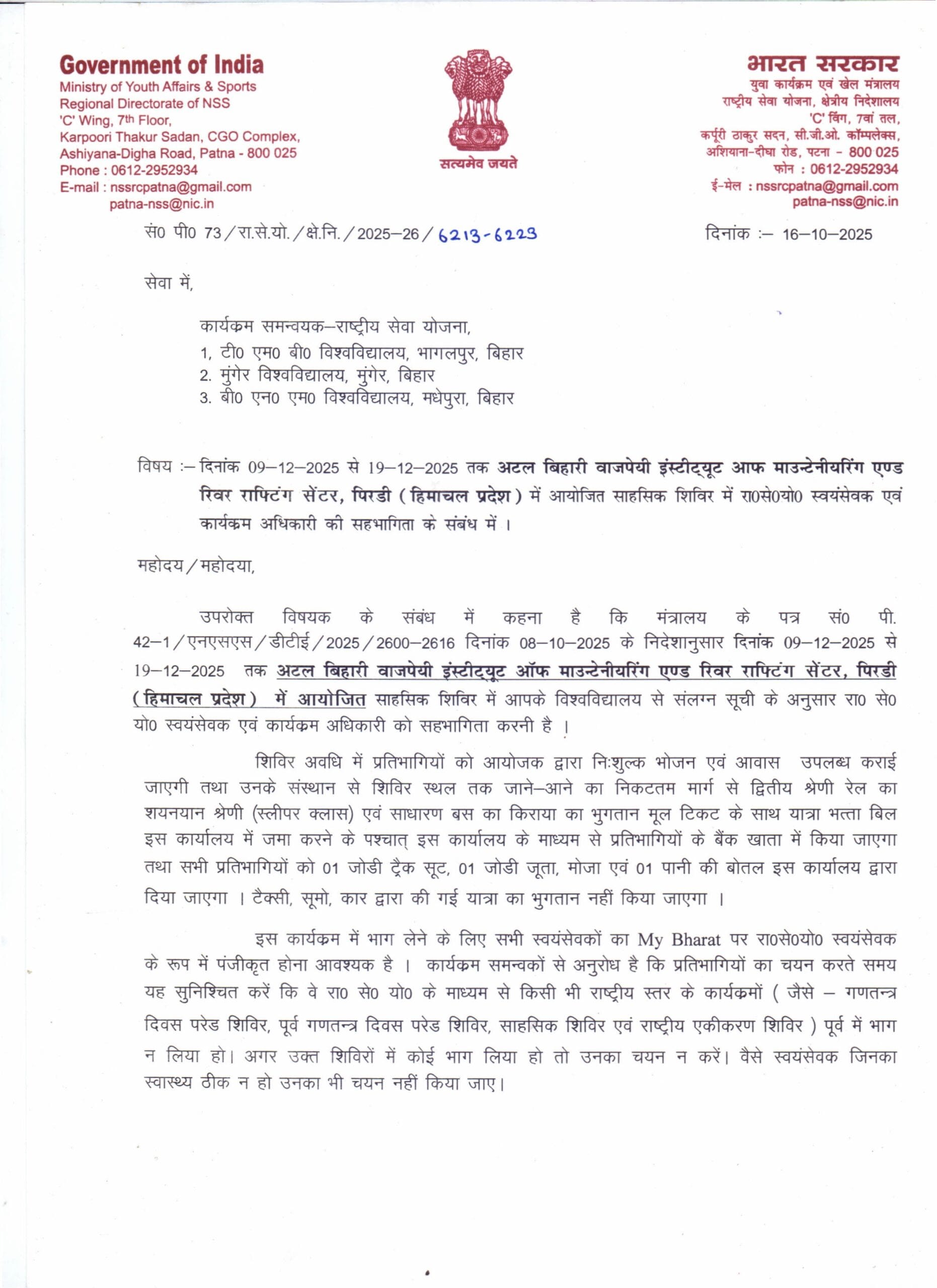 बीएनएमयू मधेपुरा के दो विद्यार्थी आगामी 9 से 19 दिसंबर, 2025 तक अटल बिहारी वाजपेयी इंस्टिट्यूट ऑफ़ माउंटेनीयरिंग एंड रिवर राफ्टिंग सेंटर, पिरडी (हिमाचल प्रदेश) में सहभागिता करेंगे। इस शिविर में भाग लेने हेतु प्रतिभा को को जाने-आने का निकटतम मार्ग से द्वितीय श्रेणी के किराया का भुगतान महाविद्यालय आंतरिक स्रोत/नियमित गतिविधि मद से किया जाएगा।
