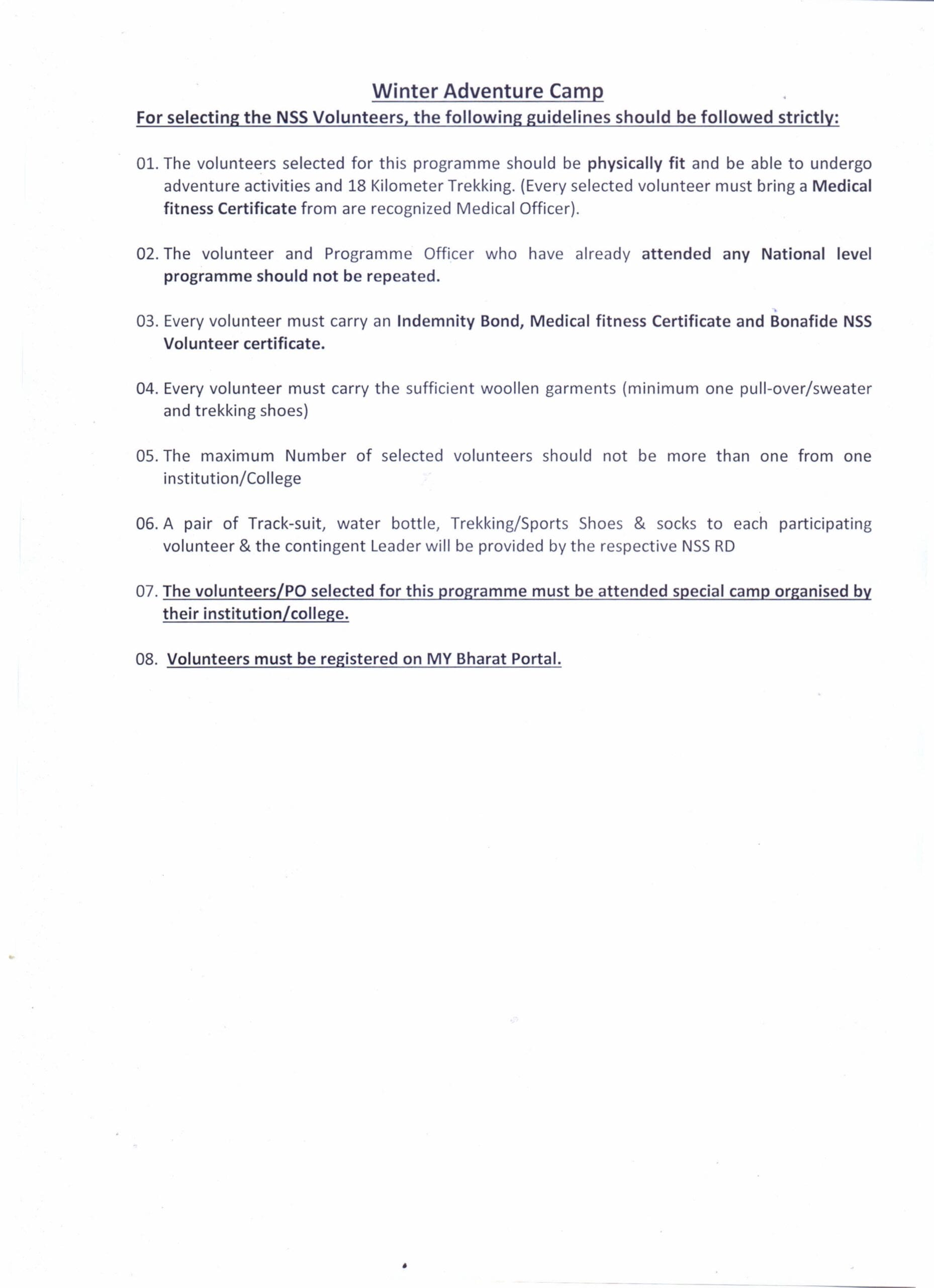 उन्होंने बताया कि विश्वविद्यालय द्वारा साहसिक शिविर हेतु एक स्वयंसेवक एवं एक स्वयंसेविका का चयन किया जाना है। इस चयन प्रकिया में भाग लेने हेतु स्वयंसेवकों के लिए कुछ अहर्ताएँ निर्धारित हैं। स्वयंसेवक माय भारत पोर्टल पर पंजीकृत हो और विगत एक वर्ष में उच्च कोटि का कार्य किया हो। सात दिवसीय विशेष शिविर में भाग लिया हो। पूर्व में पूर्व-गणतंत्र दिवस परेड शिविर, गणतंत्र दिवस परेड शिविर, साहसिक शिविर एवं राष्ट्रीय एकीकरण शिविर में भाग नहीं लिया हो।