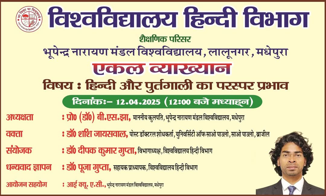 सूचना एवं आमंत्रण : एकल व्याख्यान, विश्वविद्यालय हिंदी विभाग, बीएनएमयू, मधेपुरा‌ में।