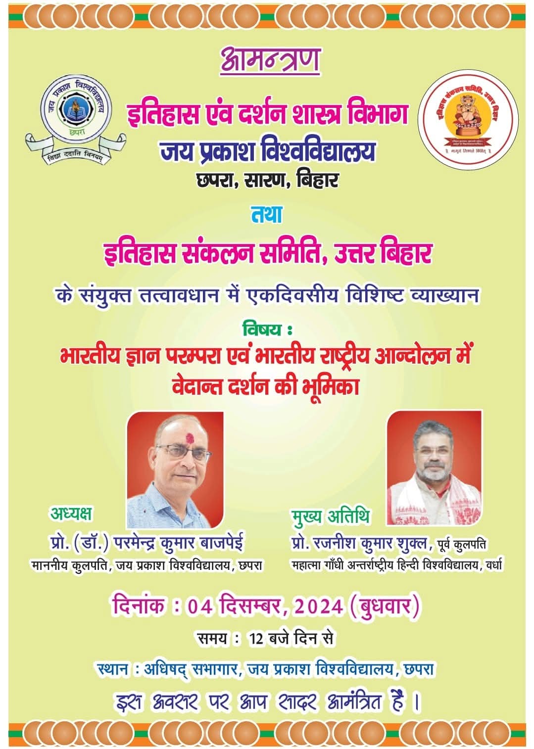 आज जयप्रकाश विश्वविद्यालय, छपरा के सीनेट हॉल में इतिहास विभाग, दर्शनशास्त्र विभाग एवं #इतिहास_संकलन_समिति #उत्तर_बिहार के संयुक्त रूप से “भारतीय ज्ञान परंपरा एवं भारतीय राष्ट्रीय आंदोलन में वेदांत दर्शन की भूमिका” विषयक एक दिवसीय विशेष व्याख्यान का आयोजन किया गया।