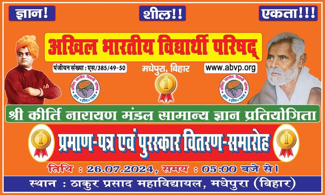 *श्री कीर्ति नारायण मंडल सामान्य ज्ञान प्रतियोगिता का प्रमाण-पत्र एवं पुरस्कार-वितरण समारोह 26 जुलाई, 2024 को* अखिल भारतीय विद्यार्थी परिषद् द्वारा 26 जुलाई, 2024 को