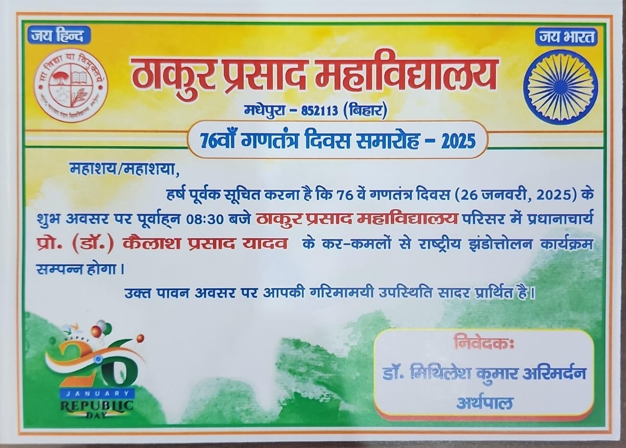 *महाविद्यालय में होगा झंडोत्तोलन* —— ठाकुर प्रसाद महाविद्यालय, मधेपुरा में रविवार को 76वां गणतंत्र दिवस समारोह पारंपरिक हर्षोल्लास के साथ मनाया जाएगा। अर्थपाल डॉ. मिथिलेश