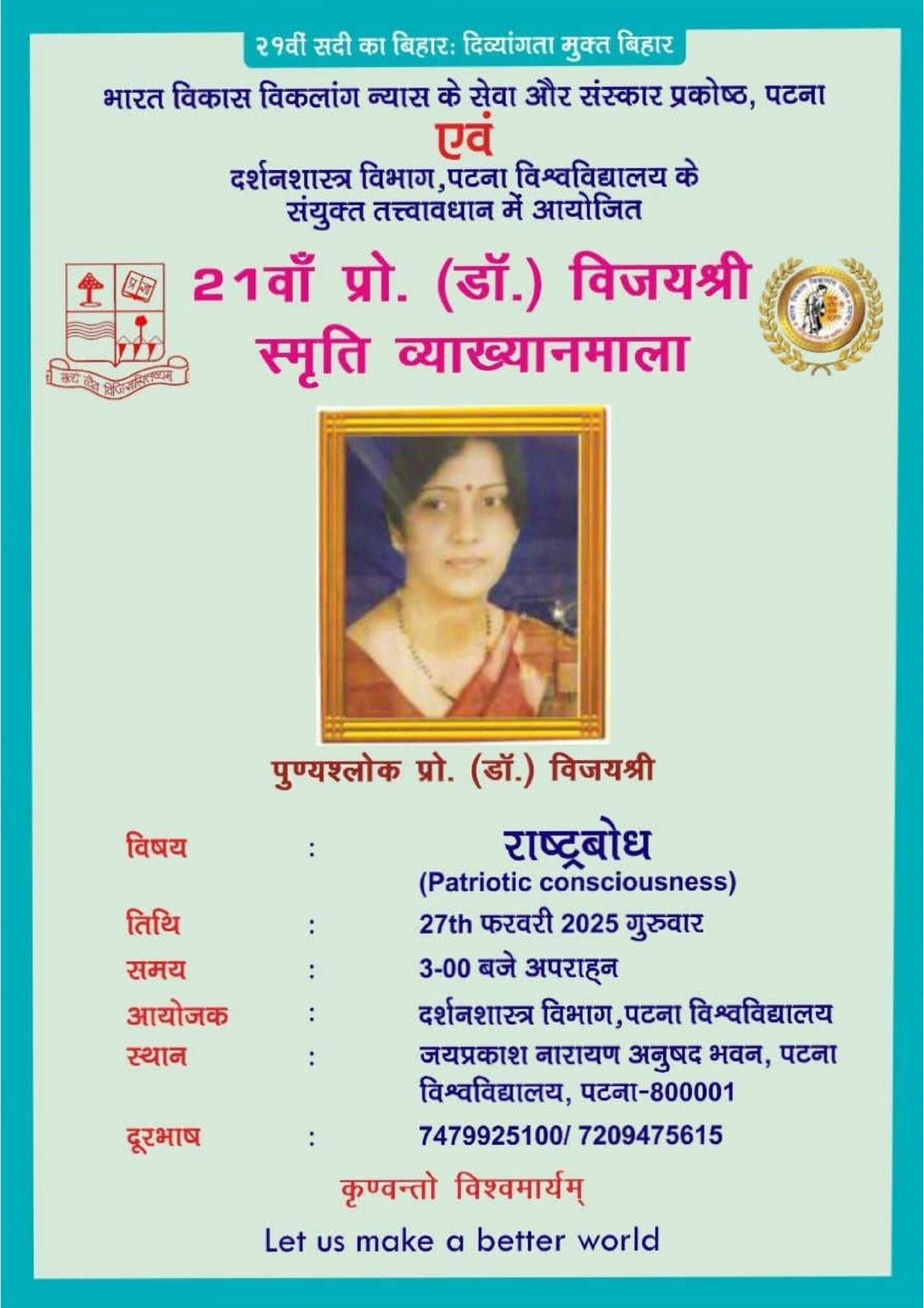 *राज्यपाल करेंगे विजयश्री स्मृति व्याख्यानमाला का उद्घाटन* पटना विश्वविद्यालय, पटना के जयप्रकाश नारायण अनुषद भवन में गुरुवार को सुप्रसिद्ध दार्शनिक प्रो. रमेशचंद्र सिन्हा की धर्मपत्नी
