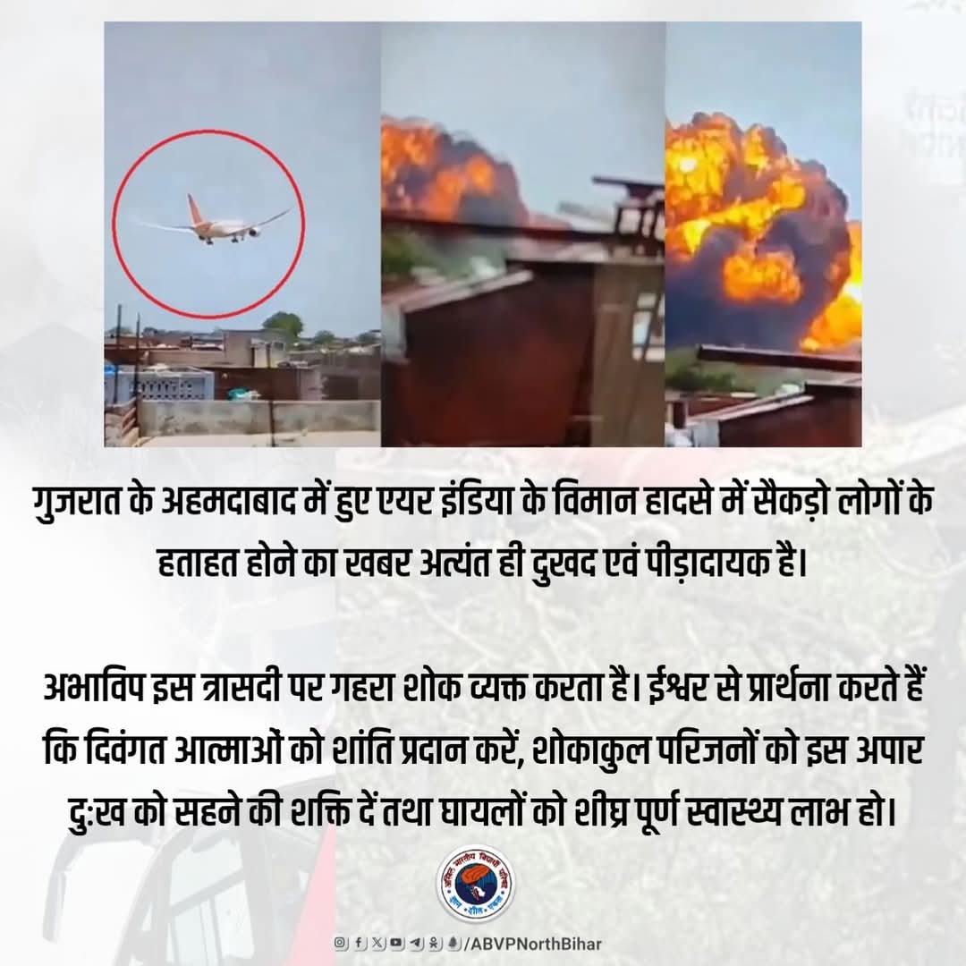 गुजरात के अहमदाबाद में हुए एयर इंडिया के विमान हादसे में सैकड़ो लोगों के हताहत होने का खबर अत्यंत ही दुखद एवं पीड़ादायक है। हम