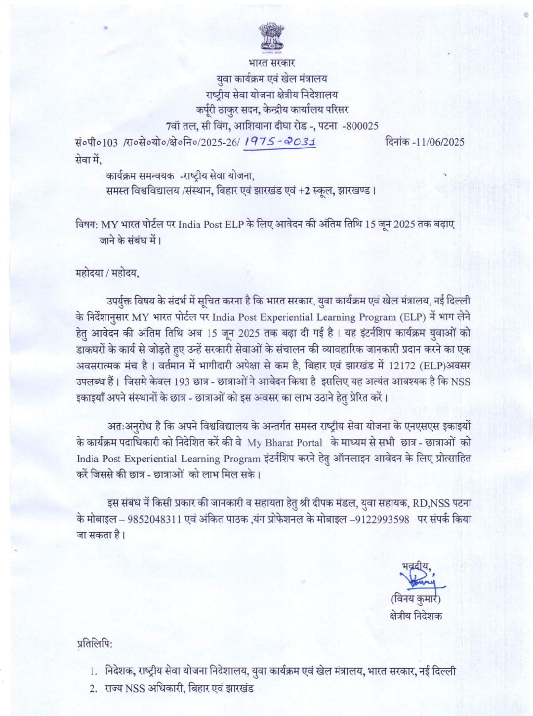 *स्वयंसेवक को मिलेगा ईएलपी में भाग लेने का अवसर* बीएनएमयू , मधेपुरा के स्वयंसेवकों को माय भारत पोर्टल के माध्यम से डाक अनुभवात्मक शिक्षण कार्यक्रम