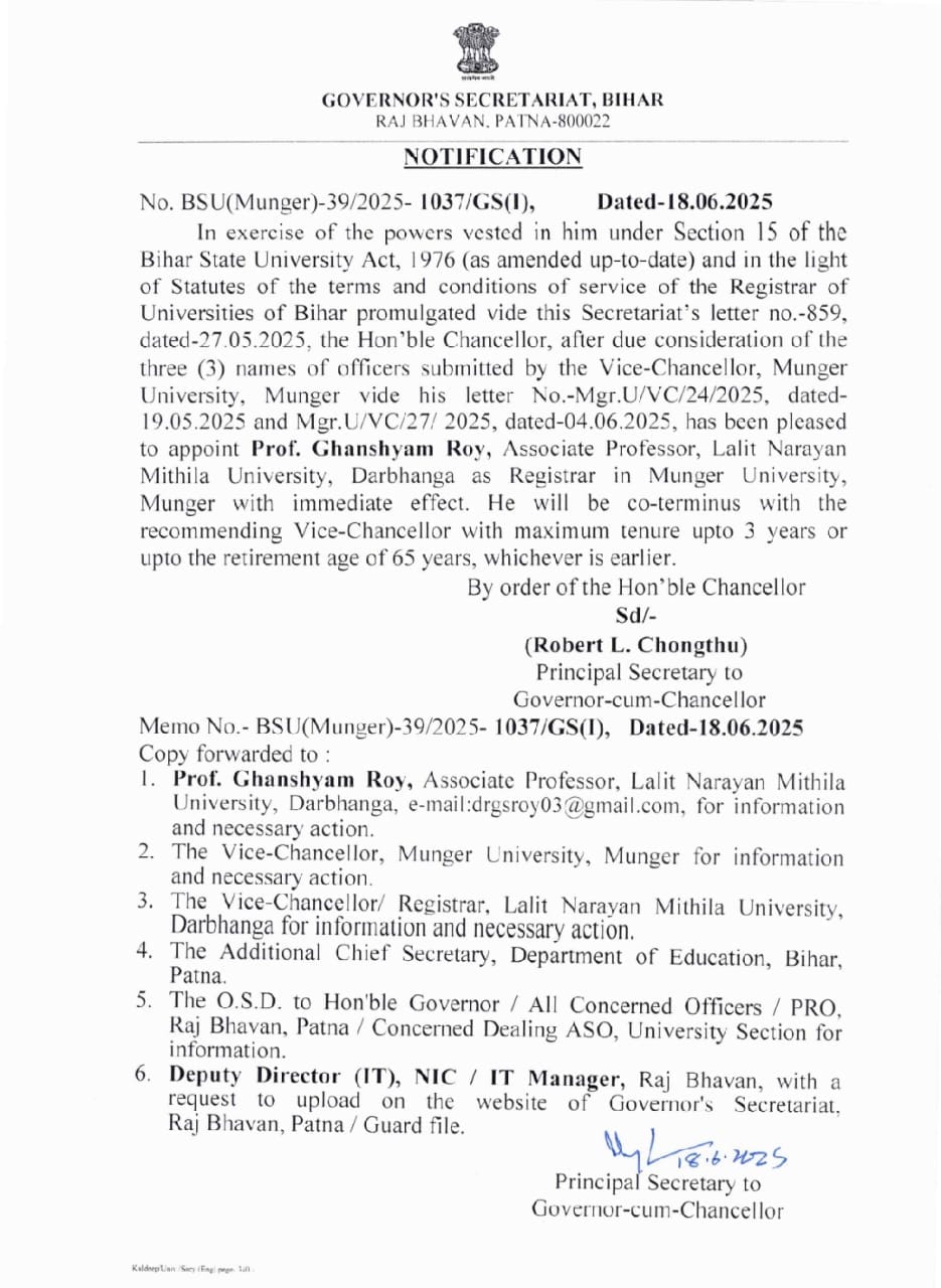 अग्रज प्रो. घनश्याम राय सर को मुंगेर विश्वविद्यालय का कुलसचिव नियुक्त होने पर बहुत बहुत बधाई एवं ढेर सारी शुभकामनाएं।