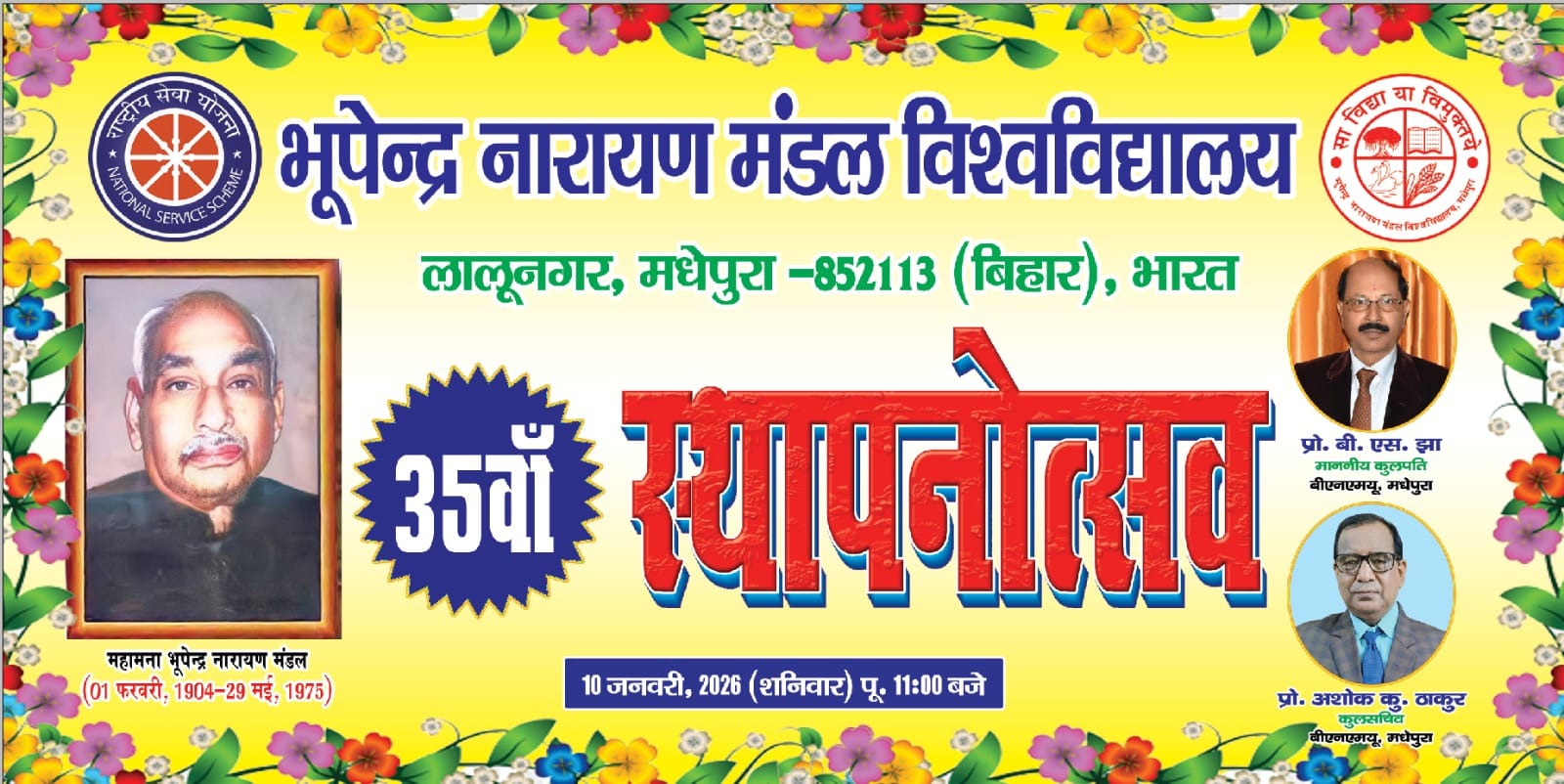 बीएनएमयू : 35वां स्थापना दिवस 10 जनवरी, 2026 को — भूपेंद्र नारायण मंडल विश्वविद्यालय, लालूनगर, मधेपुरा का 35वां स्थापना दिवस समारोह 10 जनवरी, 2026 (शनिवार)